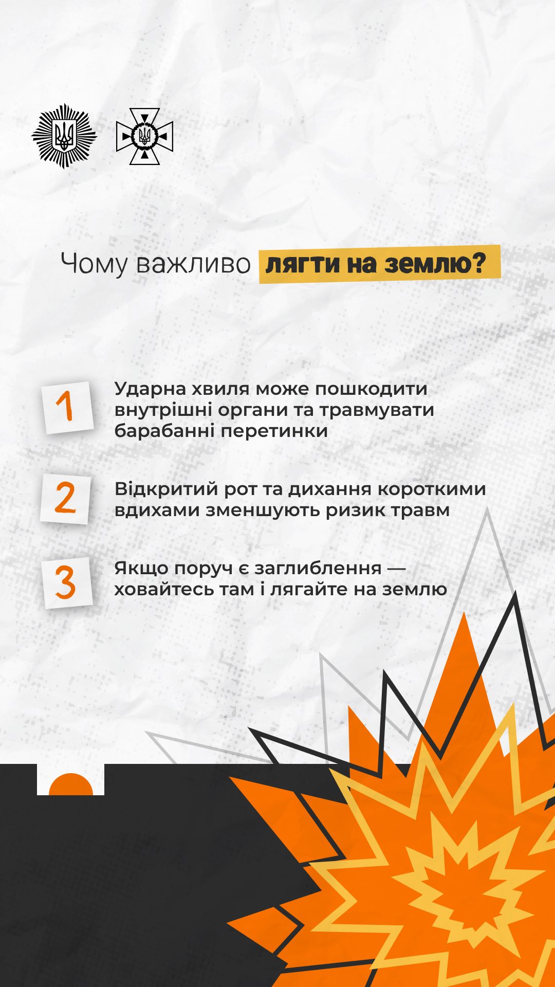 ✅Найкращий спосіб вберегти себе — сховатися за твердим укриттям або лягти на землю, прикривши голову руками.