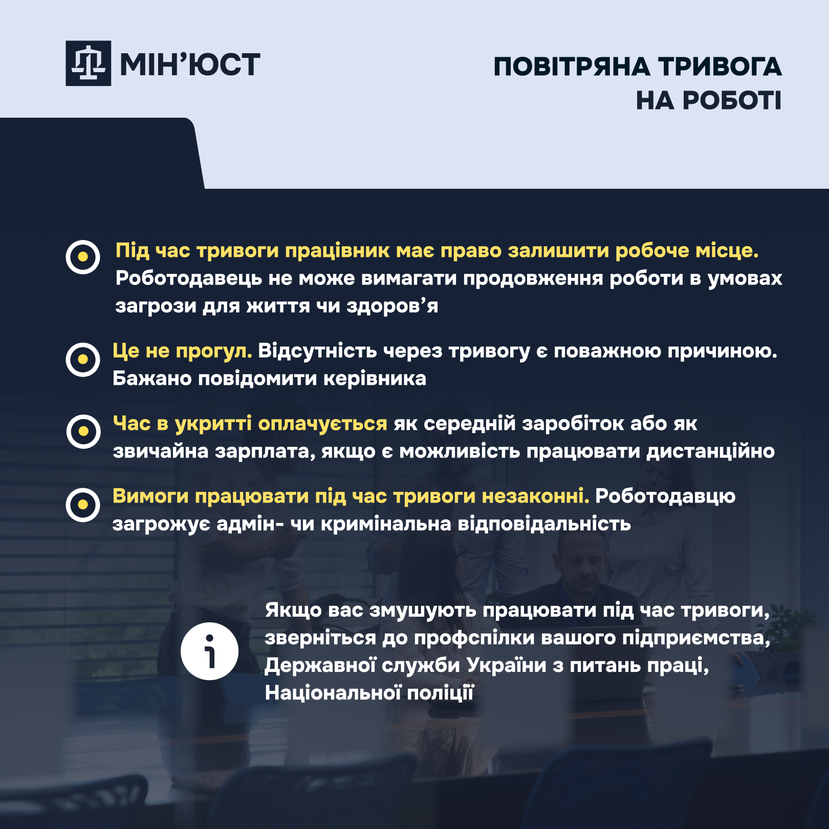 В умовах воєнного стану сигнали повітряної тривоги стали частиною щоденного життя мільйонів українців. Їх оголошення впливає не лише на безпекову ситуацію, а й на різні сфери повсякденного життя. У цьому матеріалі відповідаємо на типові запитання: чи можна залишати робоче місце під час тривоги, як у таких випадках оплачується робочий час, чи дозволено пересування містом під час комендантської години у разі тривоги та що робити, якщо вас не впускають до укриття.