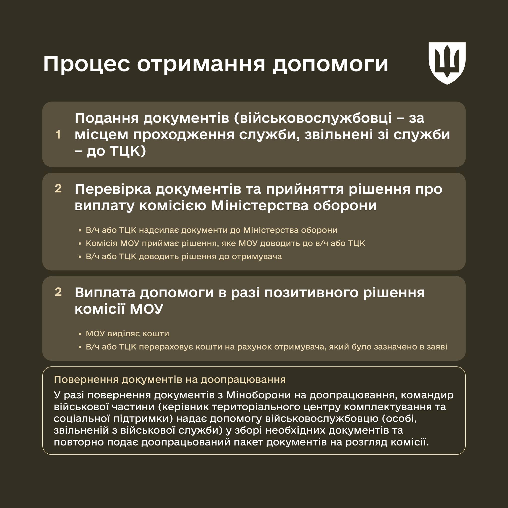 У разі позитивного рішення про виплату Міноборони здійснює фінансування, а військові частини чи обласні ТЦК перераховують кошти на рахунок отримувача.