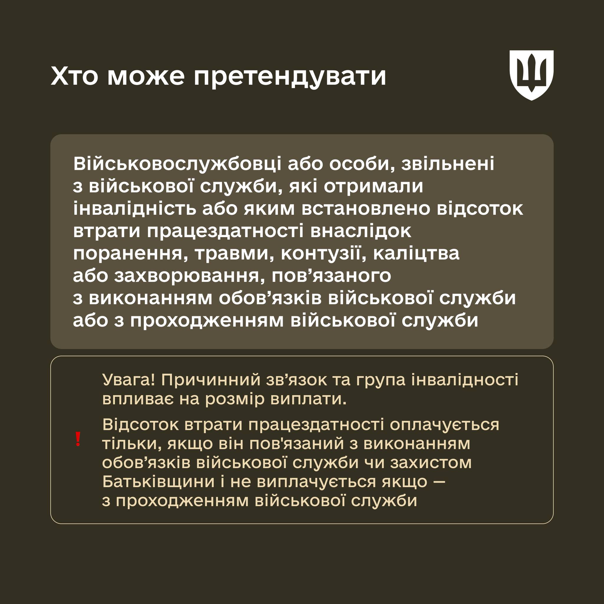 – у разі встановлення інвалідності в 2025 році – залежно від причини та групи інвалідності: від 211.9 тис. грн (3 група, пов’язана з проходженням служби) до 1 211.2 тис. грн (1 група, пов’язана з виконанням обов’язків військової служби (захистом Батьківщини)