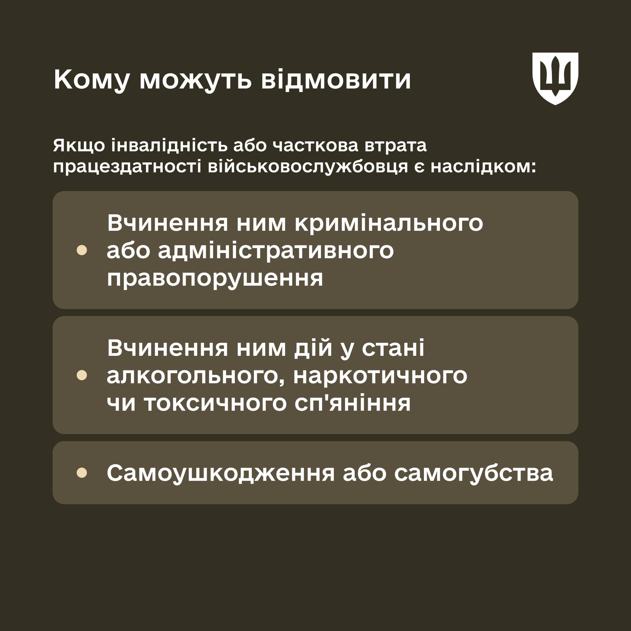Важливо зазначити, що призначення та виплати одноразової грошової допомоги не здійснюються, якщо інвалідність чи часткова втрата працездатності військовослужбовця стали наслідком: