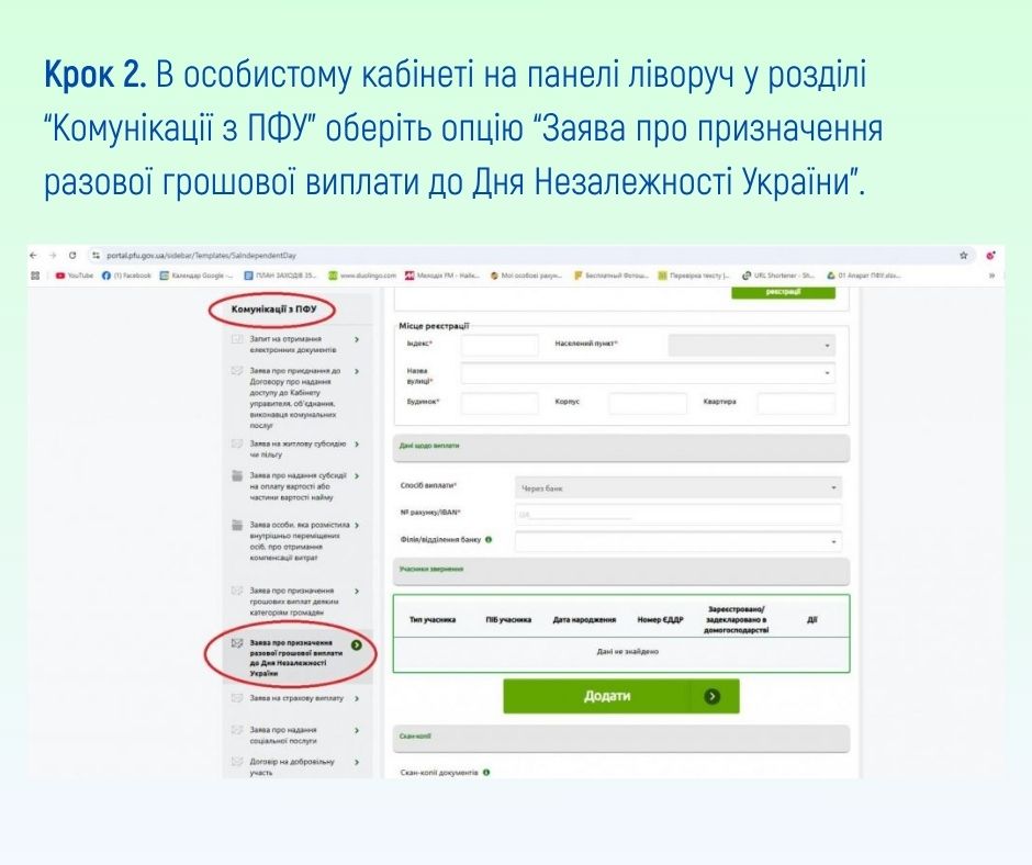 Крок 2. В особистому кабінеті на панелі ліворуч у розділі “Комунікації з ПФУ” оберіть опцію “Заява про призначення разової грошової виплати до Дня Незалежності України”.