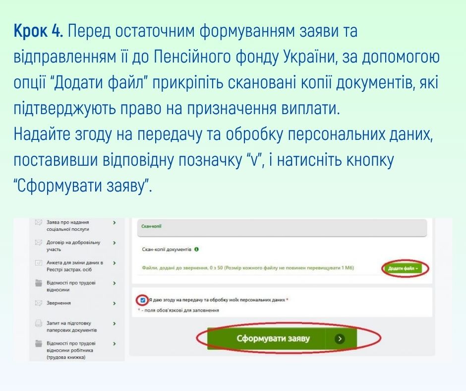 Крок 4. Перед остаточним формуванням заяви та відправленням її до Пенсійного фонду України, за допомогою опції “Додати файл” прикріпіть скановані копії документів, які підтверджують право на призначення виплати.