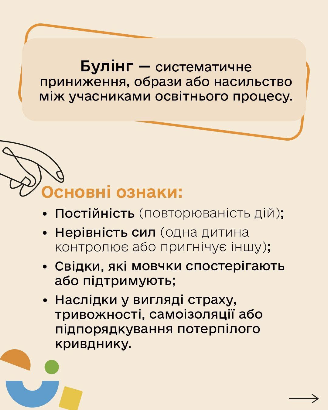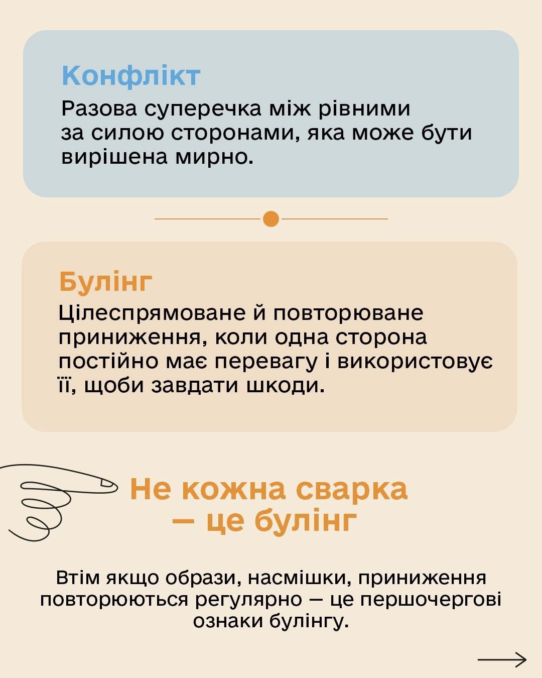 Булінг – це не просто конфлікт між дітьми, а серйозна проблема, що може мати тривалі наслідки для жертви. Він характеризується повторюваністю, дисбалансом сил та наміром завдати шкоди. Важливо навчитися розпізнавати його ознаки, щоб вчасно надати допомогу.