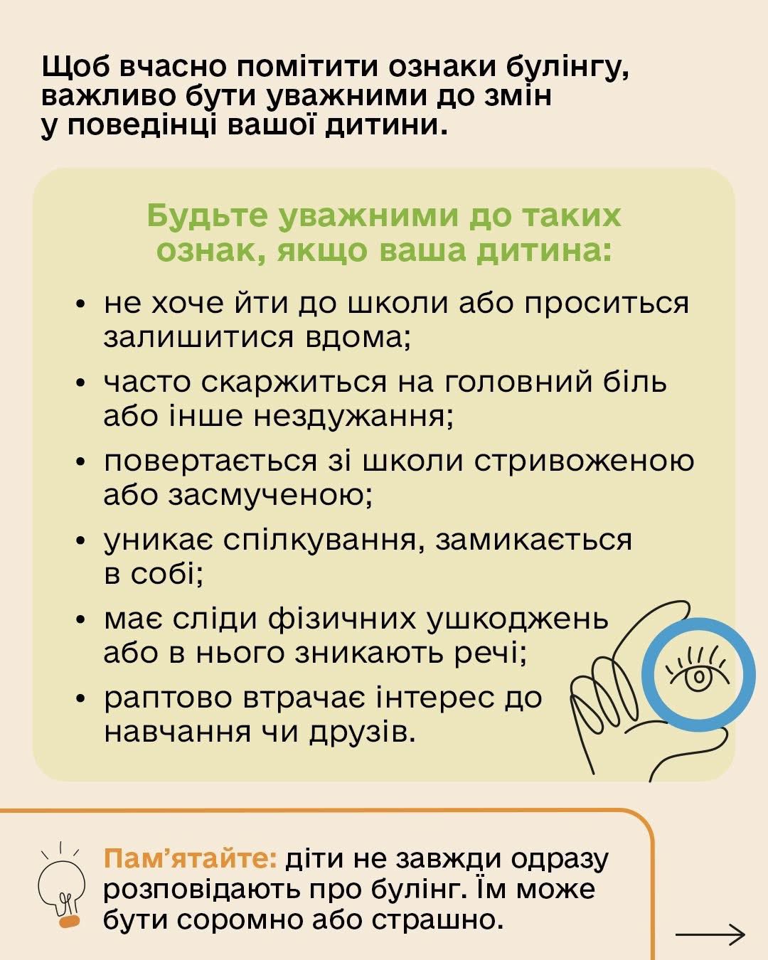 * **Фізичні ознаки:** Незрозумілі синці, подряпини, пошкоджені або «загублені» речі, часті скарги на погане самопочуття (головний біль, біль у животі) без медичних причин.