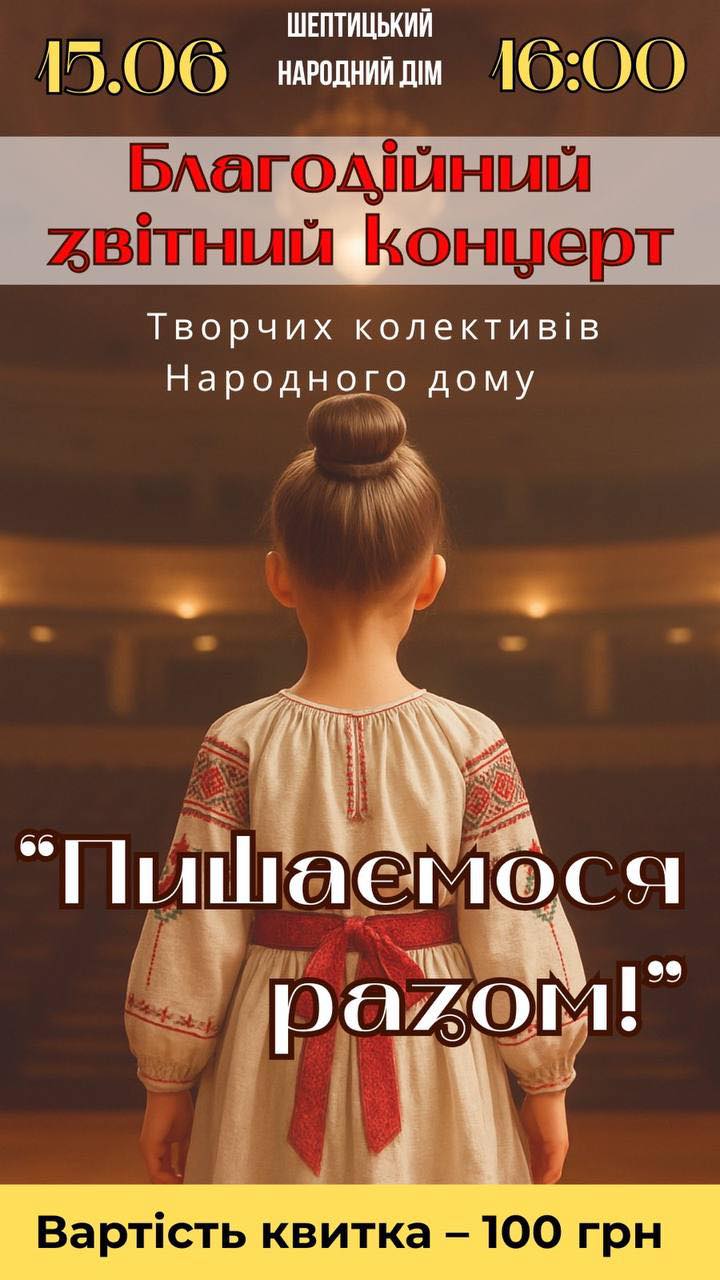 А о 16:00 відбудеться благодійний звітний концерт творчих колективів Народного дому «Пишаємось разом!». У межах підсумкової програми на вас чекає виставка художніх робіт і виробів рукоділля, створених творчими колективами Народного дому та в межах проєкту «єМістечко – Єднання поколінь». Ваш благодійний внесок у розмірі 100 грн стане цінним внеском у підтримку місцевої культури та творчості. Концерт відбудеться у Шептицькому народному домі. Приходьте та підтримайте таланти нашого краю!