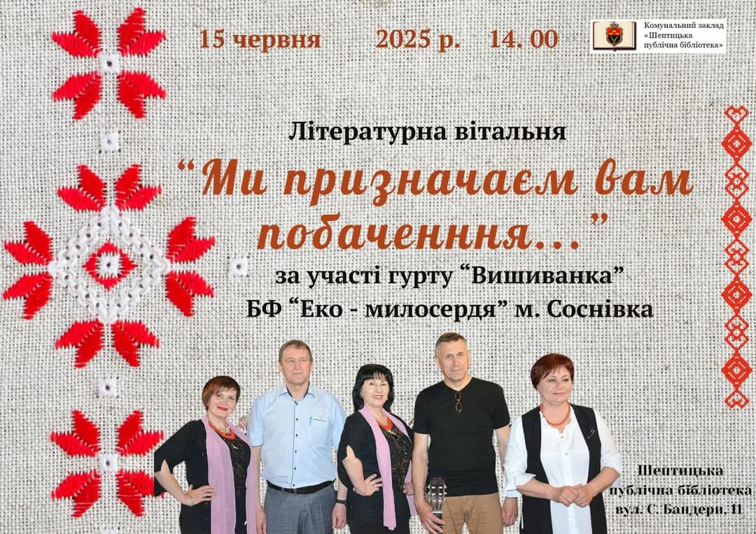 О 14:00 запрошуємо вас на літературну зустріч за участі гурту «Вишиванка» та БФ «Еко — милосердя». Це чудова можливість зануритися у світ літератури та поспілкуватися з творчими особистостями. Місце зустрічі – Шептицька публічна бібліотека. Не пропустіть шанс насолодитися прекрасним словом та підтримати важливі ініціативи!
