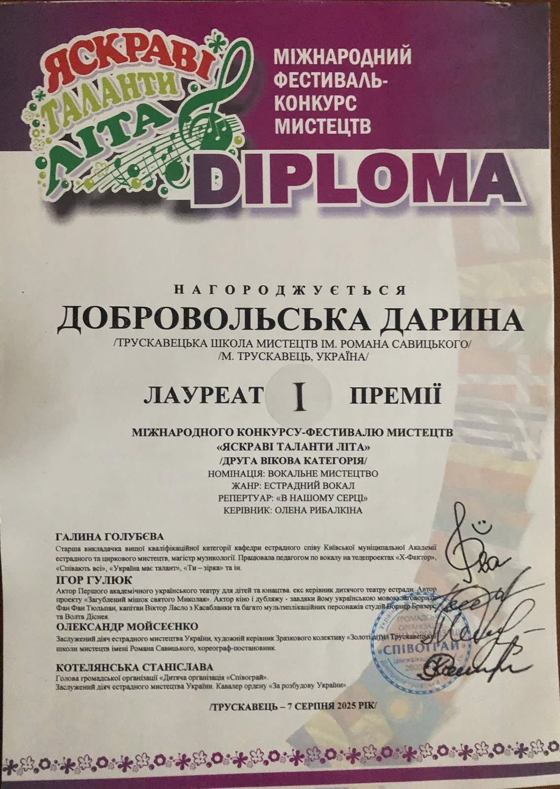 Міжнародний фестиваль-конкурс «Яскраві таланти літа» зібрав талановиту молодь у Трускавці. Подія, організована ДГО «Співограй» на базі санаторію «Кришталевий палац», стала справжнім святом мистецтва, де гідно представили себе юні обдарування з Трускавця. Особливо відзначилися вихованці гуртка «Художнє слово» Народного дому міста, керівницею якого є Георгіна Янів. У номінації «Театральне мистецтво. Художнє слово» Кароліна Кирчей здобула дві перші премії, Софія Салань – перше та друге місця, а Патрісія Артемчук також стала лауреаткою першої та другої премій. Це свідчить про високий рівень підготовки та майстерність юних артистів. Їхні виступи були відзначені журі як одні з найкращих, продемонструвавши глибоке розуміння тексту та виразність виконання. Фестиваль «Яскраві таланти літа» є чудовою платформою для розвитку молодих талантів, надаючи їм можливість показати свої вміння на міжнародному рівні та отримати цінний досвід. Успіх трускавецьких юних талантів є гордістю для їхніх наставників, батьків та всього міста. Підтвердженням їхніх досягнень стали численні нагороди та призи, отримані на конкурсі. Окремої уваги заслуговує виступ Дарини Добровольської, учениці Трускавецької школи мистецтв імені Романа Савицького. Під керівництвом Олени Рибалкіної, Дарина здобула перше місце у номінації «Вокальне мистецтво» (жанр «естрадний вокал»), вразивши всіх своїм виконанням пісні «В нашому серці». Її голос, емоційність та сценічна харизма справили незабутнє враження на глядачів та суддів. Ця перемога є результатом наполегливої праці, талану та відданості педагогічному процесу. Міжнародний фестиваль «Яскраві таланти літа» підтверджує, що Україна багата на талановиту молодь, яка здатна досягати висот у різних сферах мистецтва. Такі заходи сприяють культурному обміну, надихають на нові звершення та зміцнюють віру у майбутнє української культури. Ми щиро вітаємо всіх лауреатів фестивалю, а особливо наших юних земляків з Трускавця, з їхніми блискучими перемогами. Бажаємо їм не зупинятися на досягнутому, продовжувати розвивати свої таланти та здобувати нові вершини у світі мистецтва. Їхні досягнення є важливим стимулом для інших дітей прагнути досконалості та реалізації свого потенціалу.