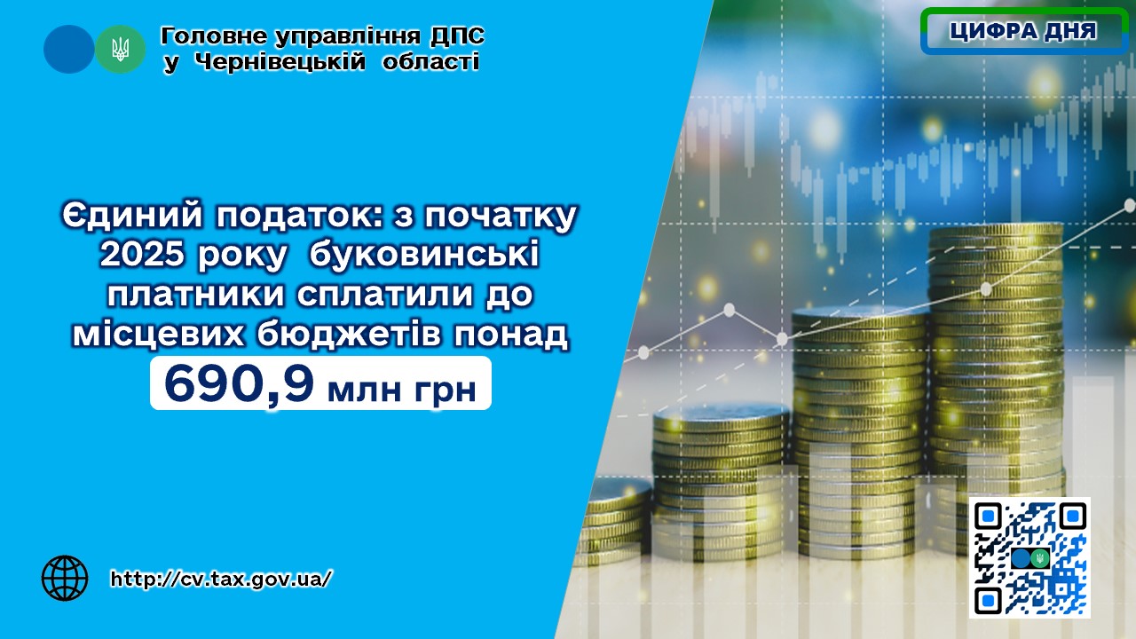 🔷Єдиний податок: з початку 2025 року буковинські платники сплатили до місцевих бюджетів понад 690,9 млн грн