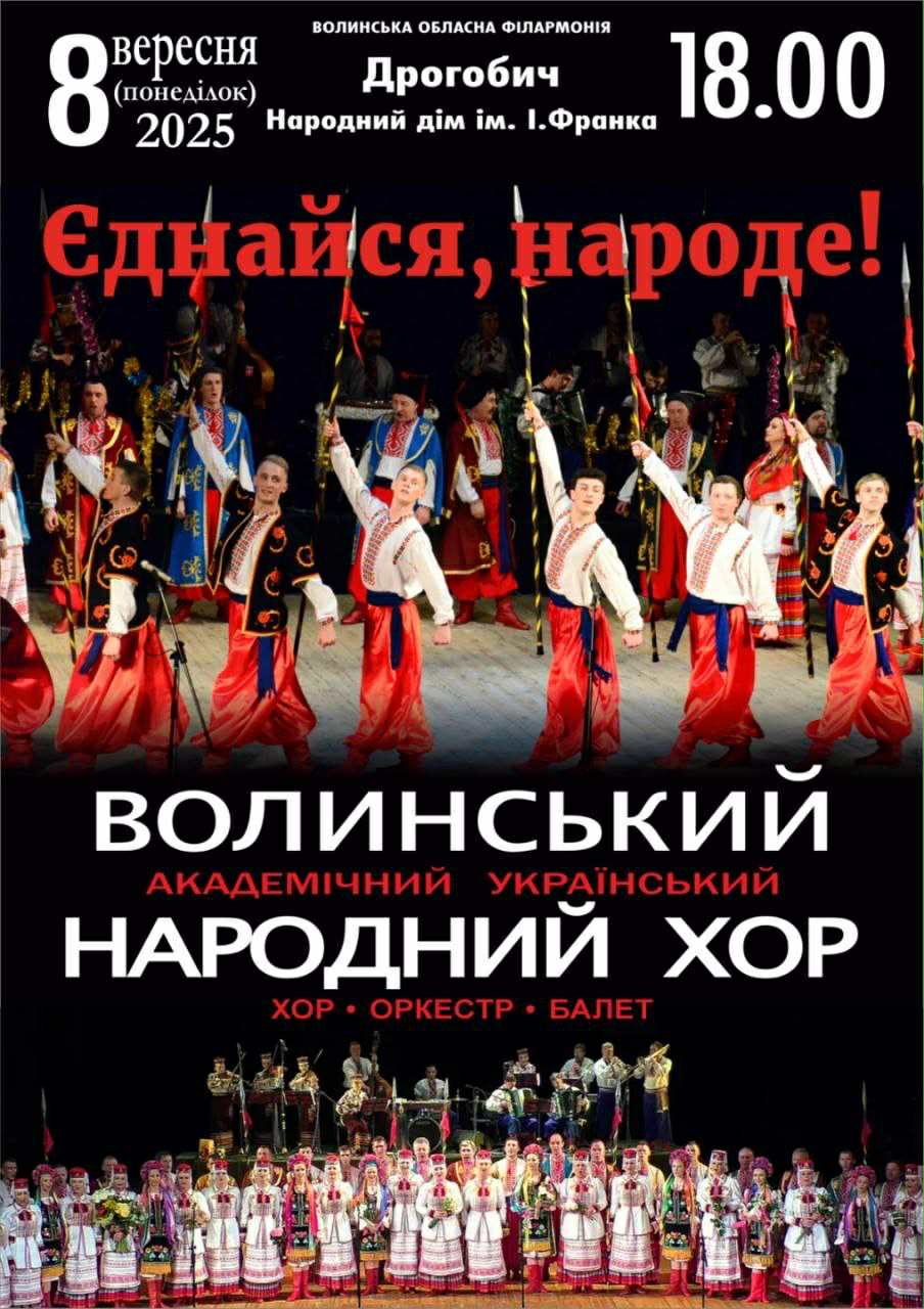 Незабутній музичний вечір чекає на мешканців та гостей Дрогобича! 8 вересня, о 18:00, у Народному домі імені Івана Франка відбудеться грандіозний виступ одного з найкращих колективів України – Волинського Академічного українського народного хору. Програма «Єднайся, народе!» обіцяє справжнє свято української пісні та культури.