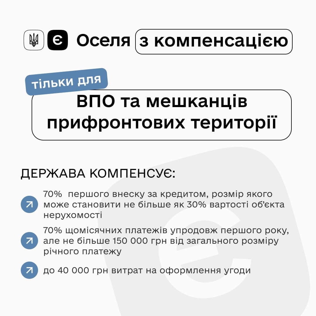 ➡ Покриття до 70% першого внеску, при цьому максимальний розмір компенсації не перевищує 30% від загальної вартості житла.
