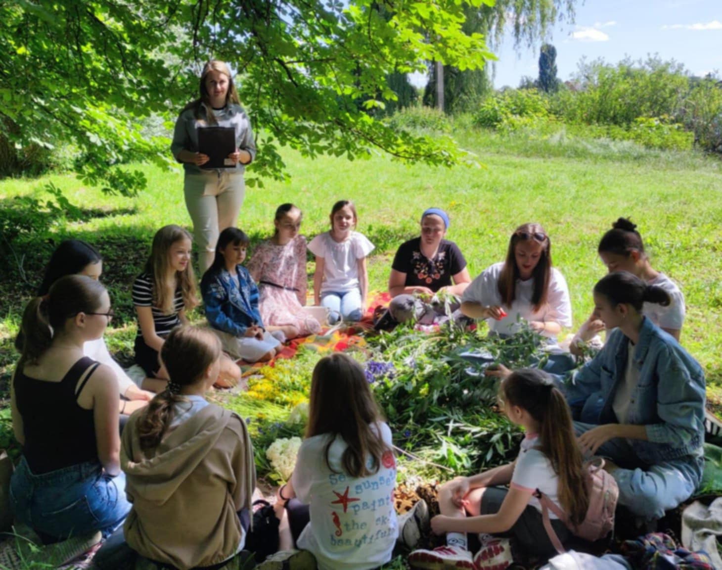 🌷 Далі наша етно-подорож преремістилася на галявину поблизу ставка, де дівчата взяли актину участь у плетінні купальських вінків із духмяних цілющих трав та квітів. 🎋