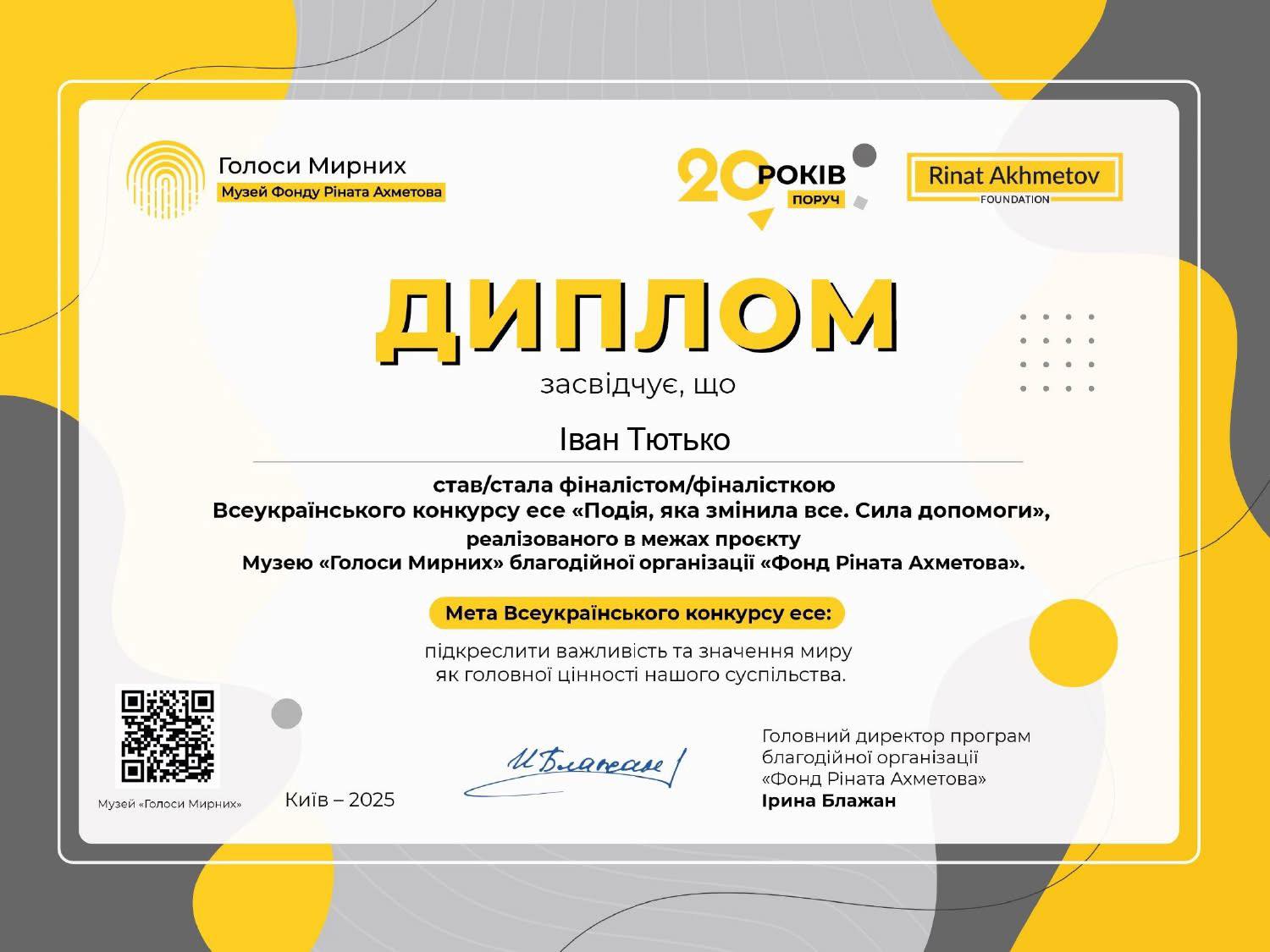 Такі ініціативи, як цей конкурс есе, мають величезне значення для формування свідомого та патріотичного покоління. Вони не лише виявляють літературні обдарування, а й виховують почуття вдячності, поваги та гордості за свою країну та її героїв. Успіх Івана Тютюшка – це спільна перемога, яка демонструє, що навіть у найскладніші часи українська молодь залишається джерелом натхнення, світла та надії. Ми пишаємося досягненнями нашого юного таланту і бажаємо йому подальших звершень, які сприятимуть світлому та мирному майбутньому України.
