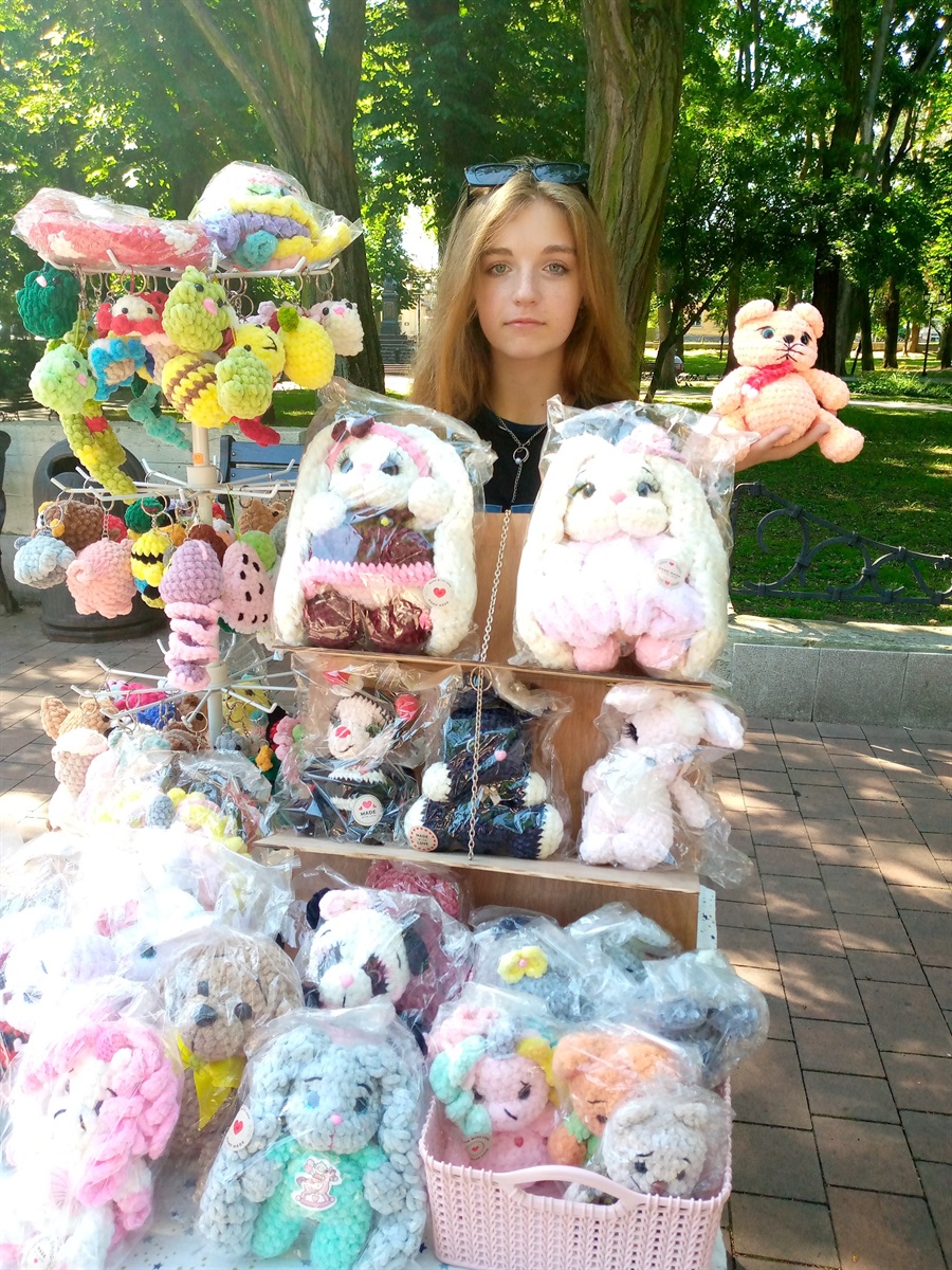 ✔️«Пробігаючи» Гоголівською у справах, раз-у-раз зупиняєшся, коли бачиш народних майстрів з їхніми роботами. І ось сьогодні, теплого липневого ранку, привернули увагу іграшки ручної роботи у стилі амігурумі (в’язання гачком з плюшевої пряжі, велюру). А біля них тендітна дівчинка. Питаюсь – Ваші?… Ну, а далі пішла розмова.