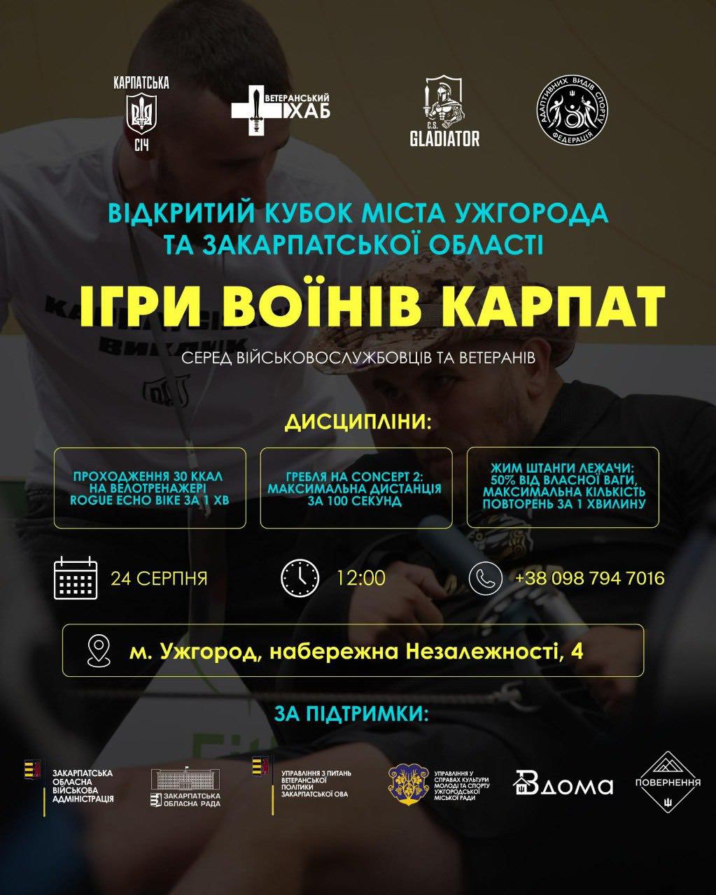 24 серпня в мальовничому Ужгороді відбудуться щорічні «Ігри Воїнів Карпат» — Відкритий кубок міста та Закарпатської області з функціональних та силових видів спорту. Ця подія стане справжнім святом сили духу та тіла, об’єднуючи тих, хто захищав нашу землю.