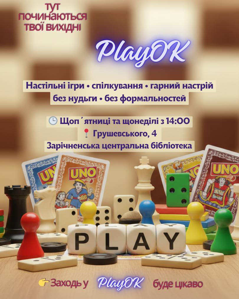 🎲 Zarichnenska Biblioteka запрошує на ігрові зустрічі PlayOK — місце для живого спілкування, настільних ігор та гарного настрою.