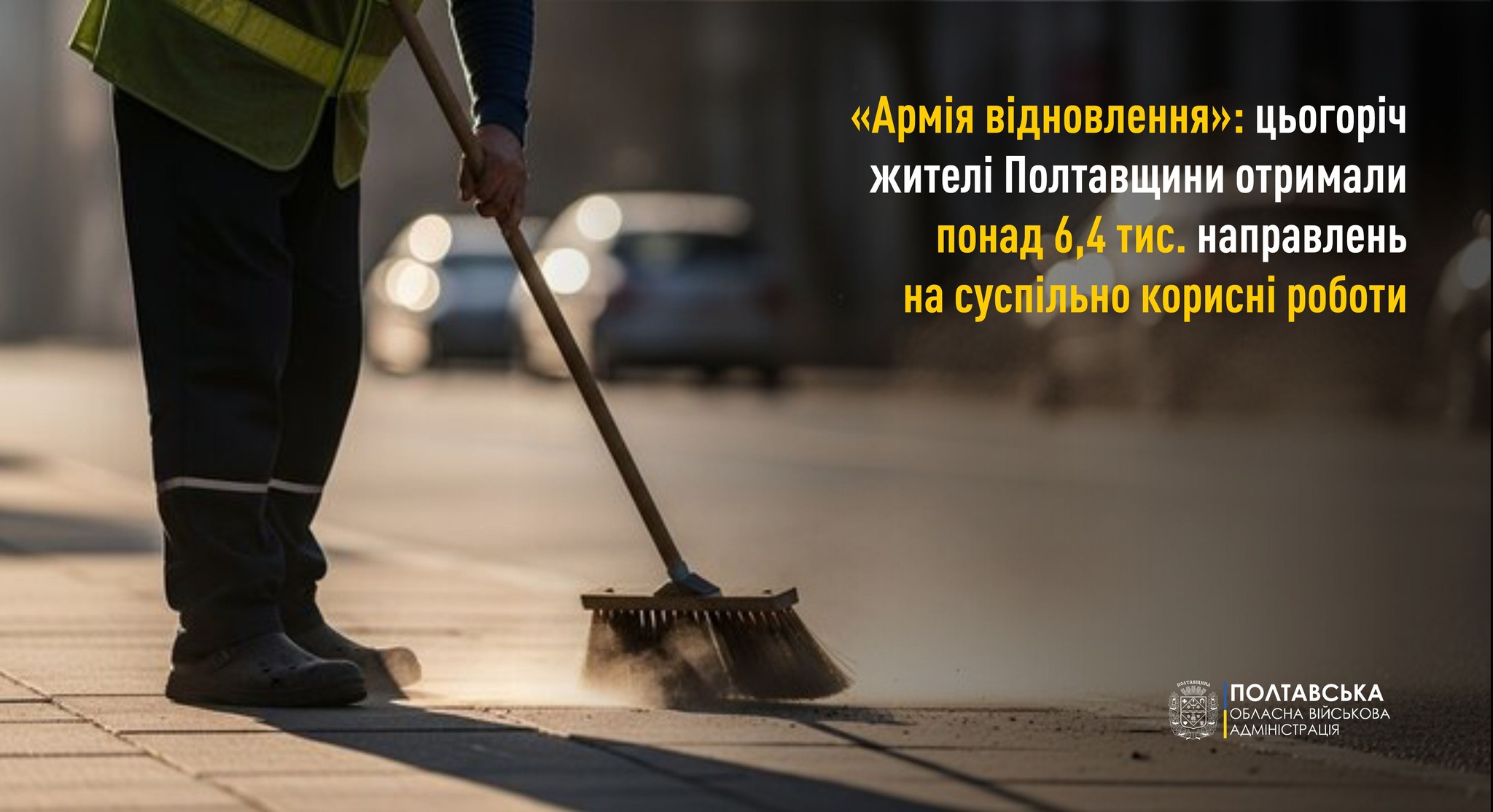 Із початку року в межах реалізації програми «Армія відновлення» обласна служба зайнятості видала понад 6,4 тис. направлень жителям Полтавщини, яких залучили до суспільно корисних робіт. На оплату праці робітників спрямовано більше 58,5 млн грн. За цим показником наша область займає друге місце в Україні.