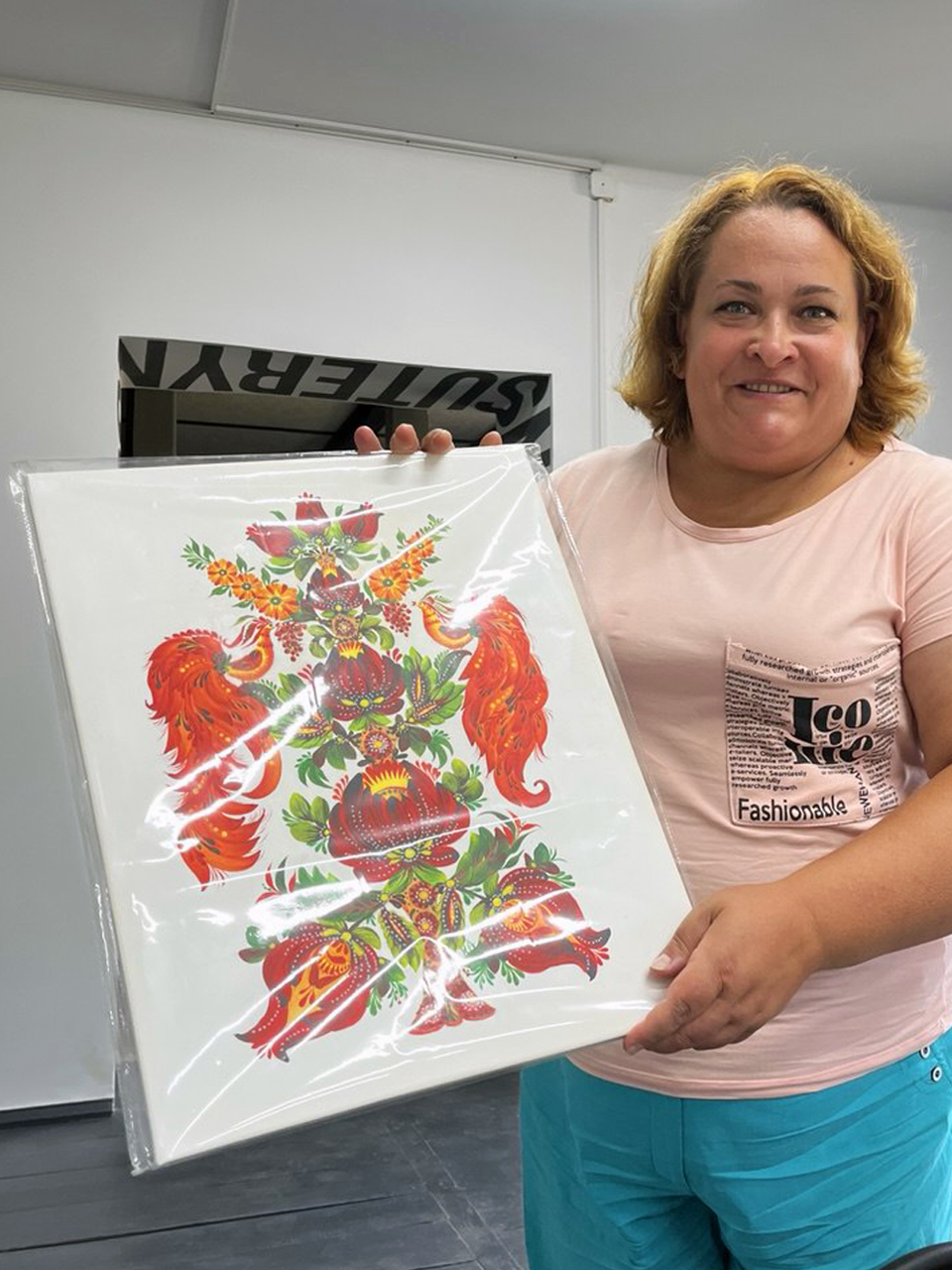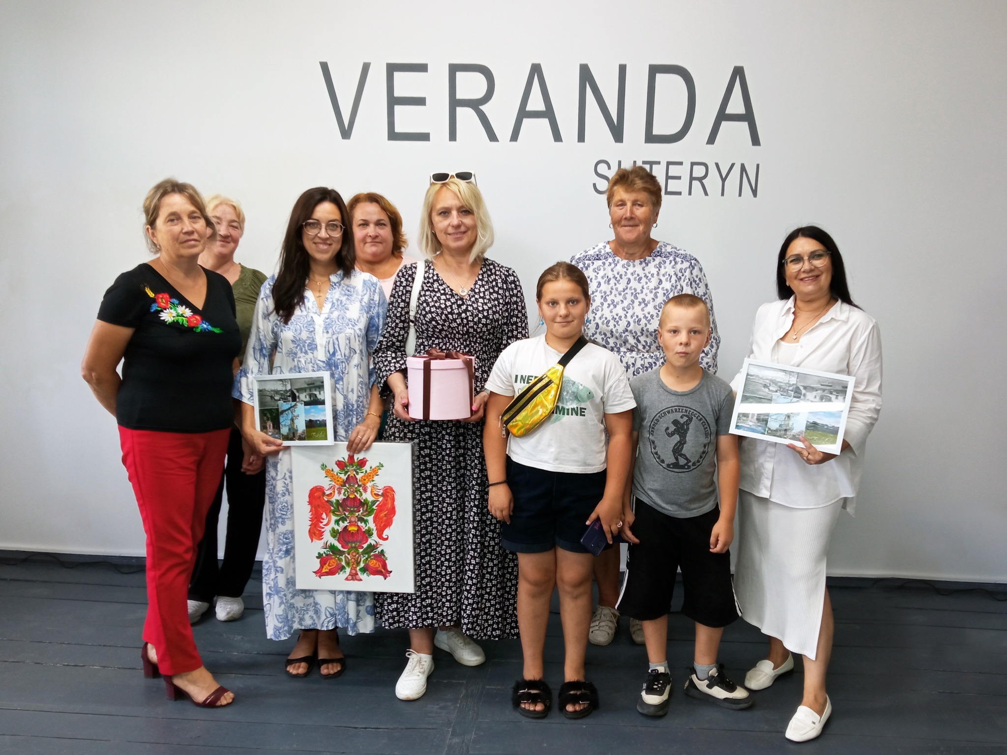 Завершальною точкою нашої екскурсії (яка вже і так затягнулася на дві з гаком години) був палац і Веранда Сутерин. Гості подарували нашому громадському простору велику вазу і розписану тарілку. Дійсно вдалий подарунок, бо вази і посуд – те, що шукаємо найчастіше. Ми ж приготували чаювання та невеличкі подарунки: колажі із пейзажами та визначними місцями Биковець, а також із чорно-білим фото В. Лукянова, де видно стару хату над Кручею, в якій колись жили Ольга і Людмила; Алла Процишина подарувала свою картину, виконану Петриківським розписом – “Дерево роду” (символічно, бо частина цього гіллястого дерева Мисечків народилась саме у Биківцях); трохи солодощів, а ще була пісня, яку, за допомогою ШІ, зробив Анатолій Гаврилюк. Вона створена із вірша Людмили Василівни – «Україно моя!» й була подарунком від молоді Биковець – Suteryn. Страшенно хвилювались, що пісня з деякими погрішностями в римах і наголосах (така вже особливість ШІ). Але ми навіть не думали, що вона матиме такий ефект. Майже 4 хвилини усі присутні не стримували сліз, а п. Юлія, поглядаючи в наш бік, здивовано піднімала брови над мокрими очима, щоразу, коли починався новий куплет. Вона здавалась враженою і вдячною водночас. Тепер ми відчували подвійну приємність, бо п. Юлія має музичну освіту й розуміється на музиці. Сюрприз вдався☺