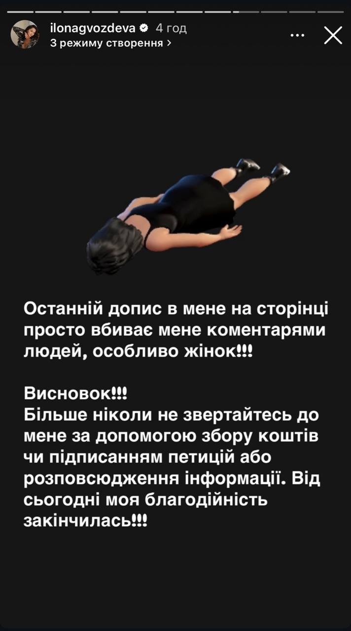 Ілона не витримала напруги та написала емоційний допис в Instagram. Вона наголосила, що хоче розставити всі кордони й поставити таких хейтерів на місце. Тож зазначила, що просто блокуватиме їх і показуватиме їхні фото у себе на сторінці. Проте згодом вона видалила допис і написала новий, де знову повідомила, що остаточно вирішила назавжди припинити публічну благодійну діяльність.