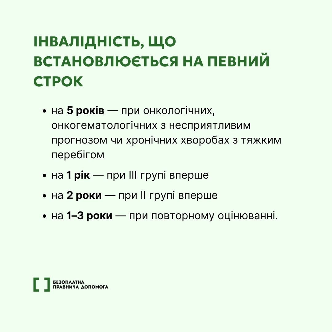 Термін, на який встановлюється інвалідність, може бути різним: як безстроково, так і на певний період (зазвичай, 1-5 років). Це залежить від характеру захворювання, його прогнозу та можливості відновлення функцій. Для осіб з певними групами інвалідності передбачаються різні види державної підтримки, пільги та реабілітаційні заходи, спрямовані на максимальну інтеграцію в суспільство.