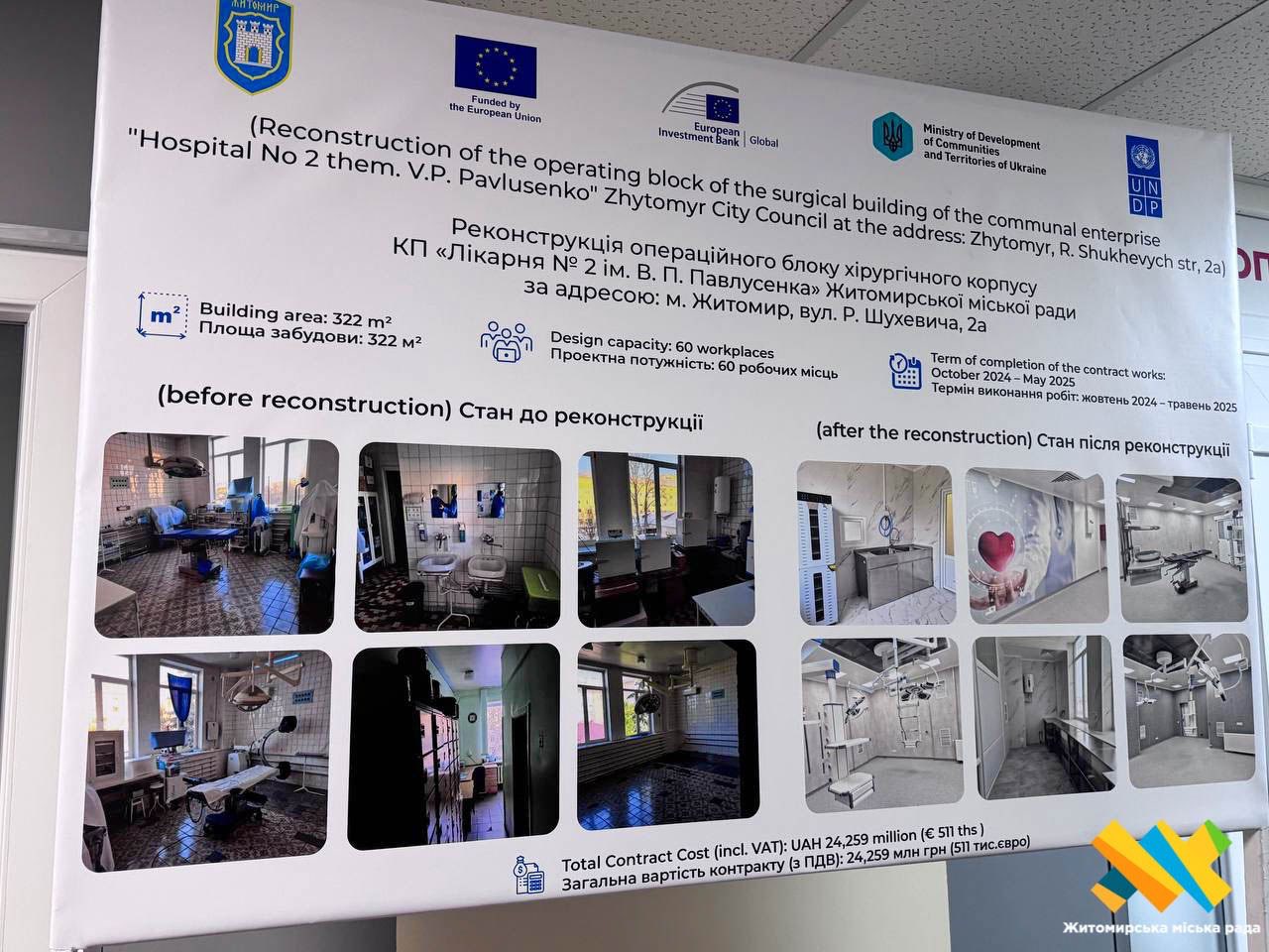 Загальна кошторисна вартість реконструкції операційного блоку становить 28,5 мільйона гривень, з яких 24,2 мільйона – вартість будівельних робіт. Станом на 14 травня 2025 року будівельні роботи завершені та профінансовано понад 15,6 мільйона гривень, включаючи кошти з бюджету Житомирської міської територіальної громади та державної субвенції.
