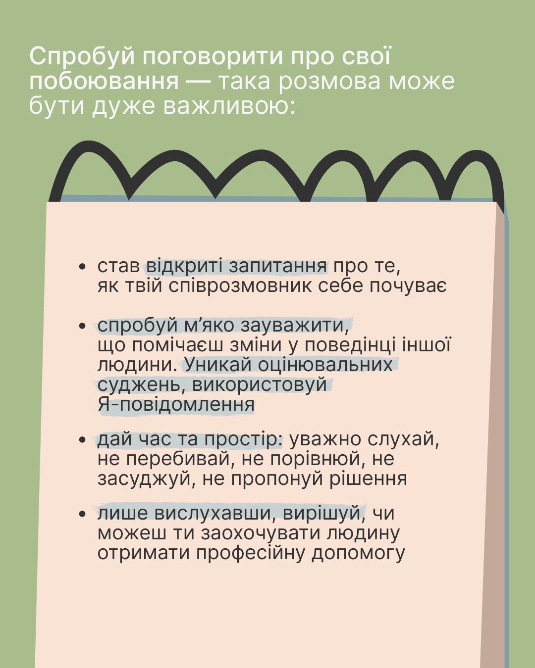 Перш за все, намагайтеся уникати прямих рекомендацій або фраз на кшталт «візьми себе в руки». Замість цього, зосередьтеся на тому, щоб просто бути поруч і надавати підтримку. Ваша присутність і готовність вислухати вже є великою допомогою. Щоб краще підготуватися до важливої розмови про ментальне здоров’я, перегляньте корисні поради, які ми підготували для вас.
