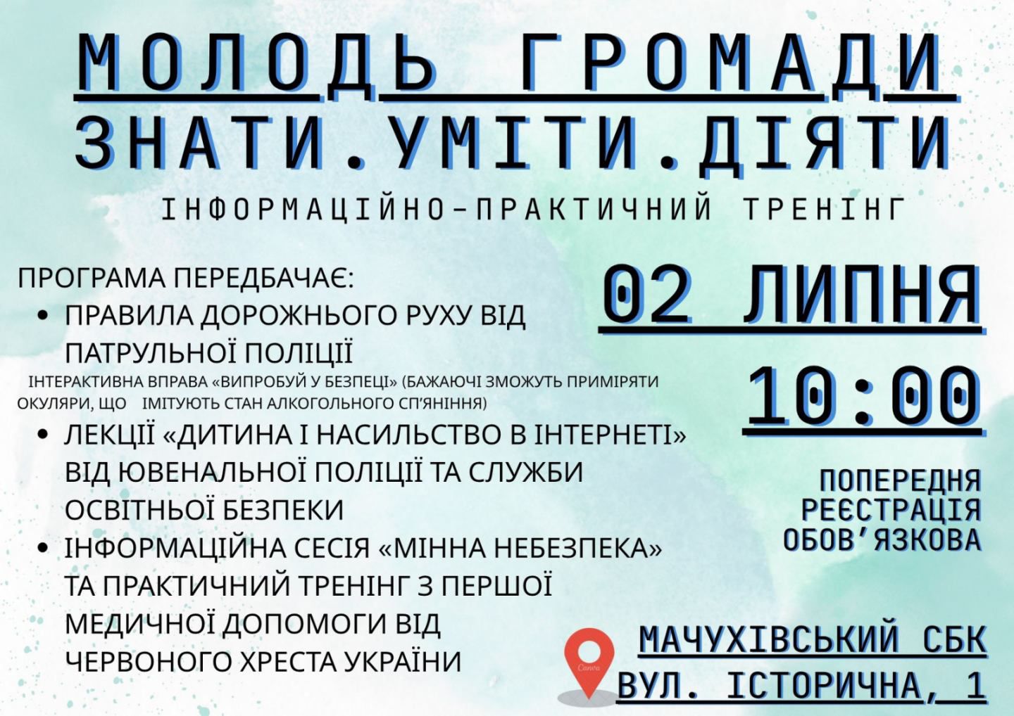 Не пропустіть цю унікальну можливість! Зробіть свій внесок у власний розвиток та підвищення рівня безпеки у вашій громаді. Дата проведення: середа, 2 липня, початок о 10:00. Місце проведення: с. Мачухи, Мачухівський СБК, Полтавська область. Для довідок та отримання додаткової інформації звертайтеся за контактним номером: 0997186807.