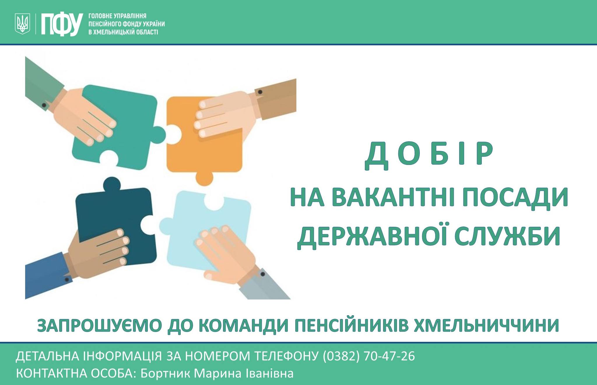 Головне управління Пенсійного фонду України в Хмельницькій області оголошує конкурс на зайняття вакантної посади державної служби категорії «В». Ми шукаємо кваліфікованого кандидата на посаду провідного спеціаліста – юрисконсульта відділу договірної роботи юридичного управління. Робоче місце розташоване у місті Хмельницький.
