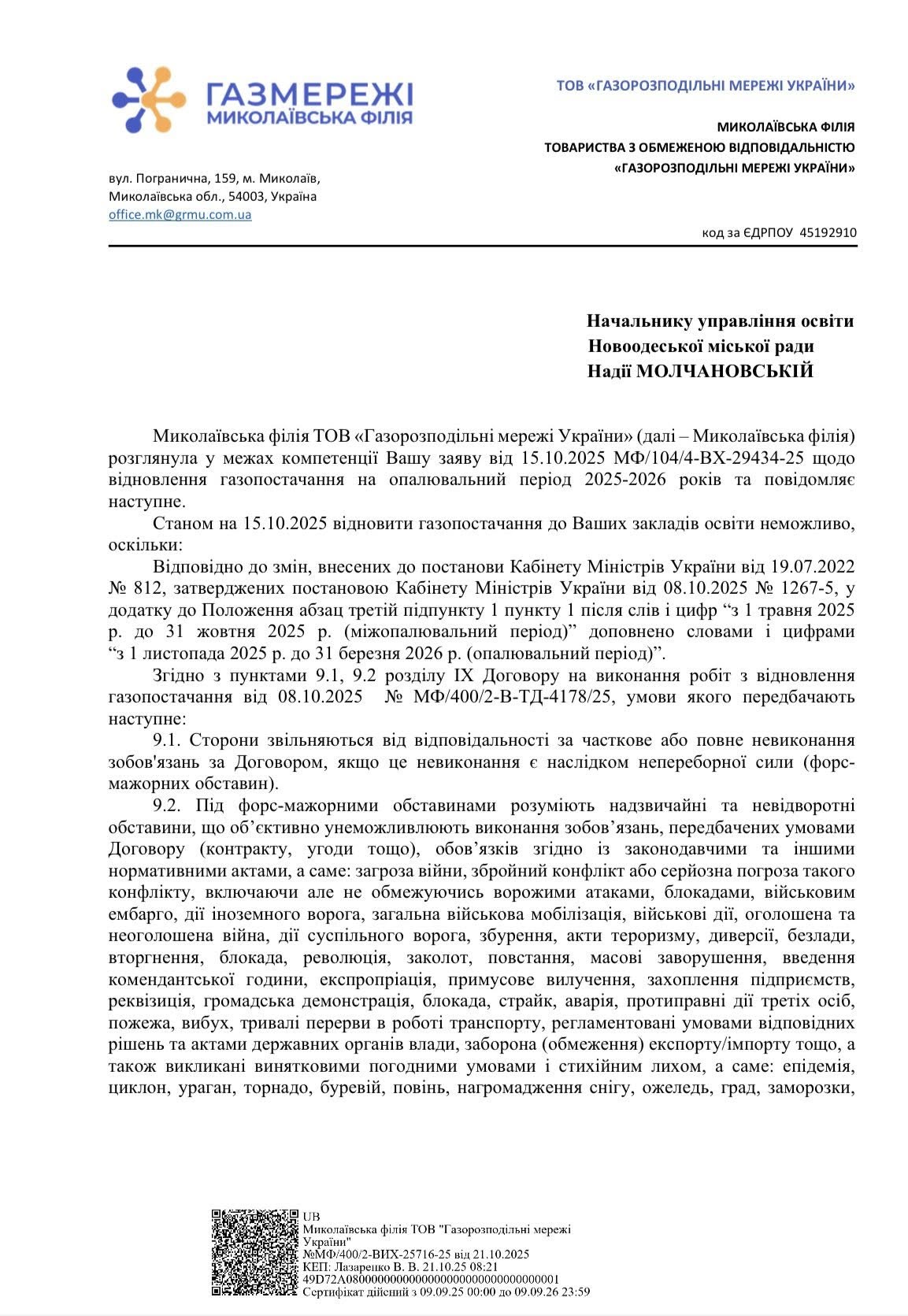 Ми розуміємо, що ця новина може викликати занепокоєння, особливо в умовах підготовки до опалювального сезону. Питання забезпечення закладів освіти та соціальної сфери необхідними комунальними послугами є пріоритетним для місцевої влади. Управління освіти Новоодеської міської ради неодноразово зверталося до ТОВ «Газорозподільні мережі України» з запитами щодо термінів та умов підключення.