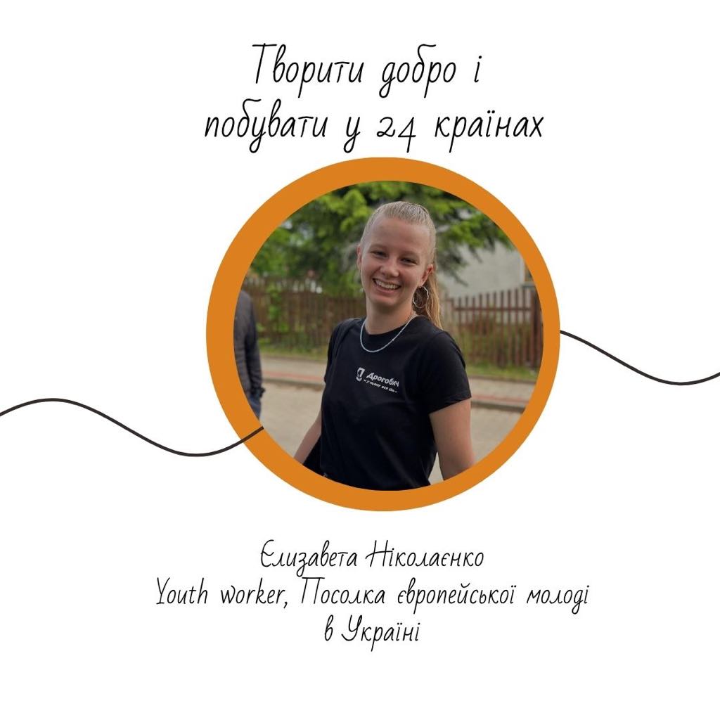 - Єлизавета Ніколаєнко – ще одна посолка європейської молоді в Україні. Її тема – “Творити добро і побувати у 24 країнах” – розповість про можливості та важливість міжнародного досвіду, а також про те, як подорожі та добрі справи можуть змінювати світогляд та розширювати горизонти.