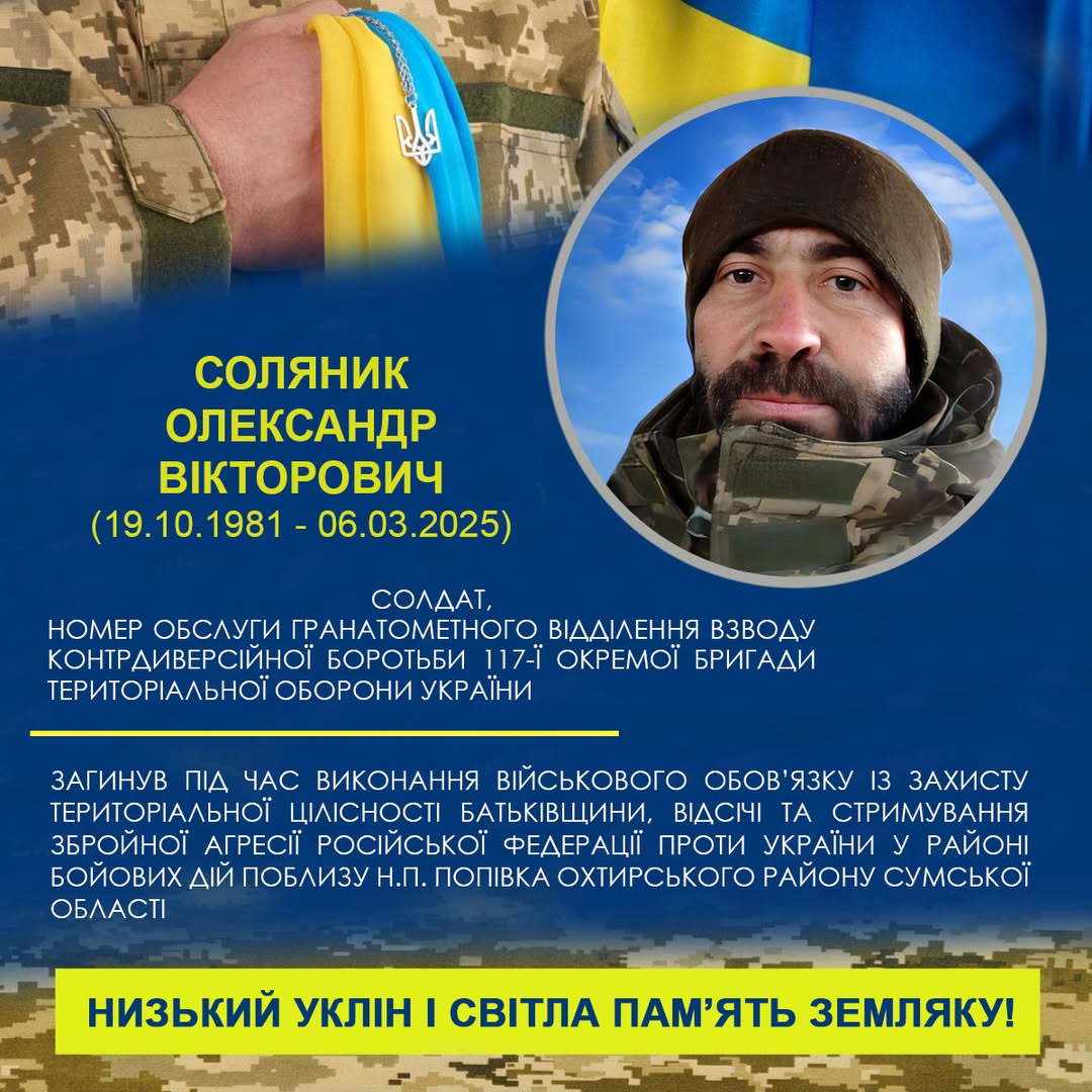 😢З глибоким сумом повідомляємо про непоправну втрату в нашій громаді. Під час захисту України від російських окупантів загинув наш земляк, солдат Соляник Олександр Вікторович, мужній воїн 117-ї окремої бригади територіальної оборони України. Його життя обірвалося, захищаючи нашу свободу та незалежність.