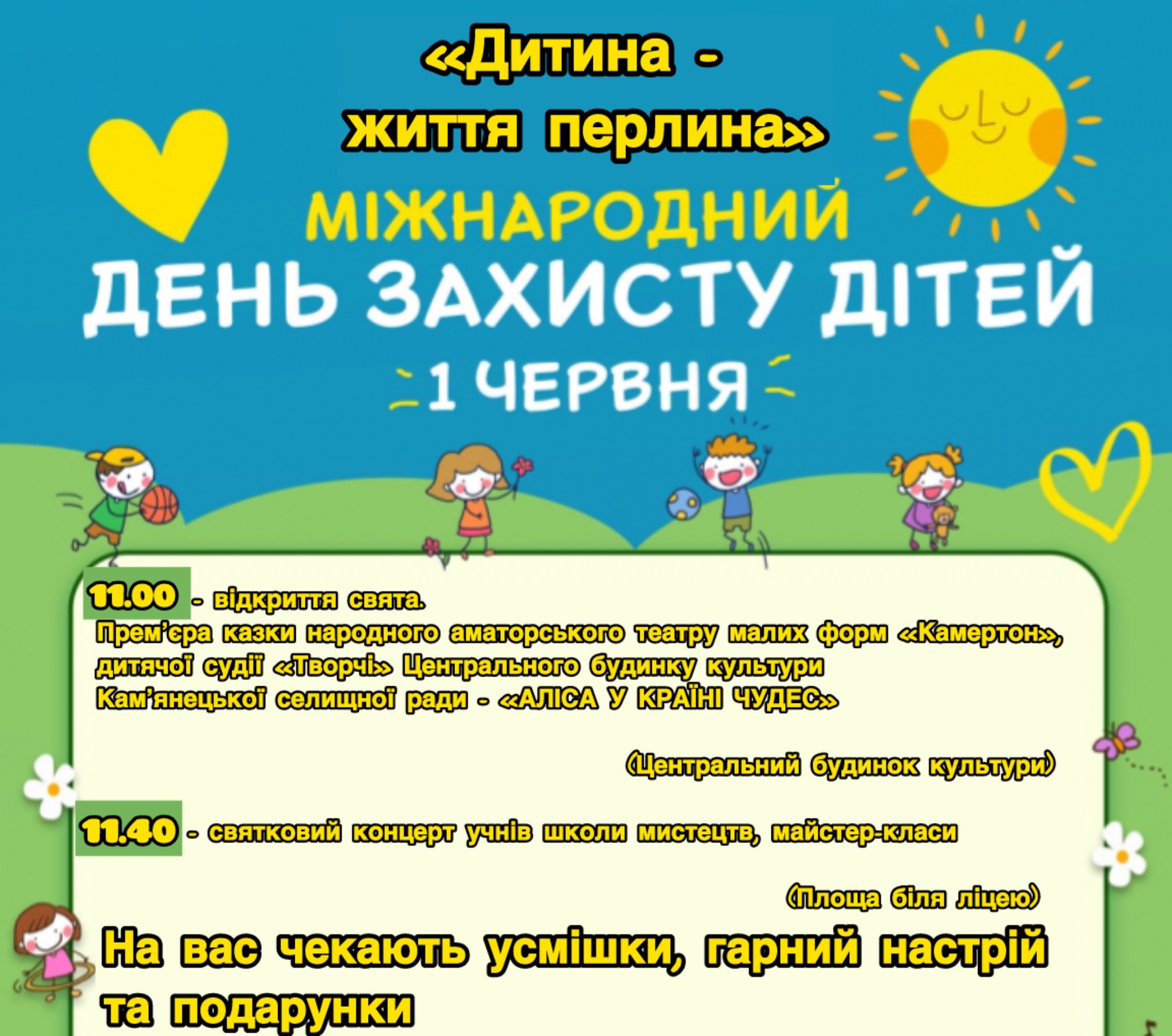 Кам’янецька Територіальна Громада запрошує всіх бажаючих приєднатися до святкування Міжнародного Дня захисту дітей. Подбайте про те, щоб цей день став для вашої дитини незабутнім!