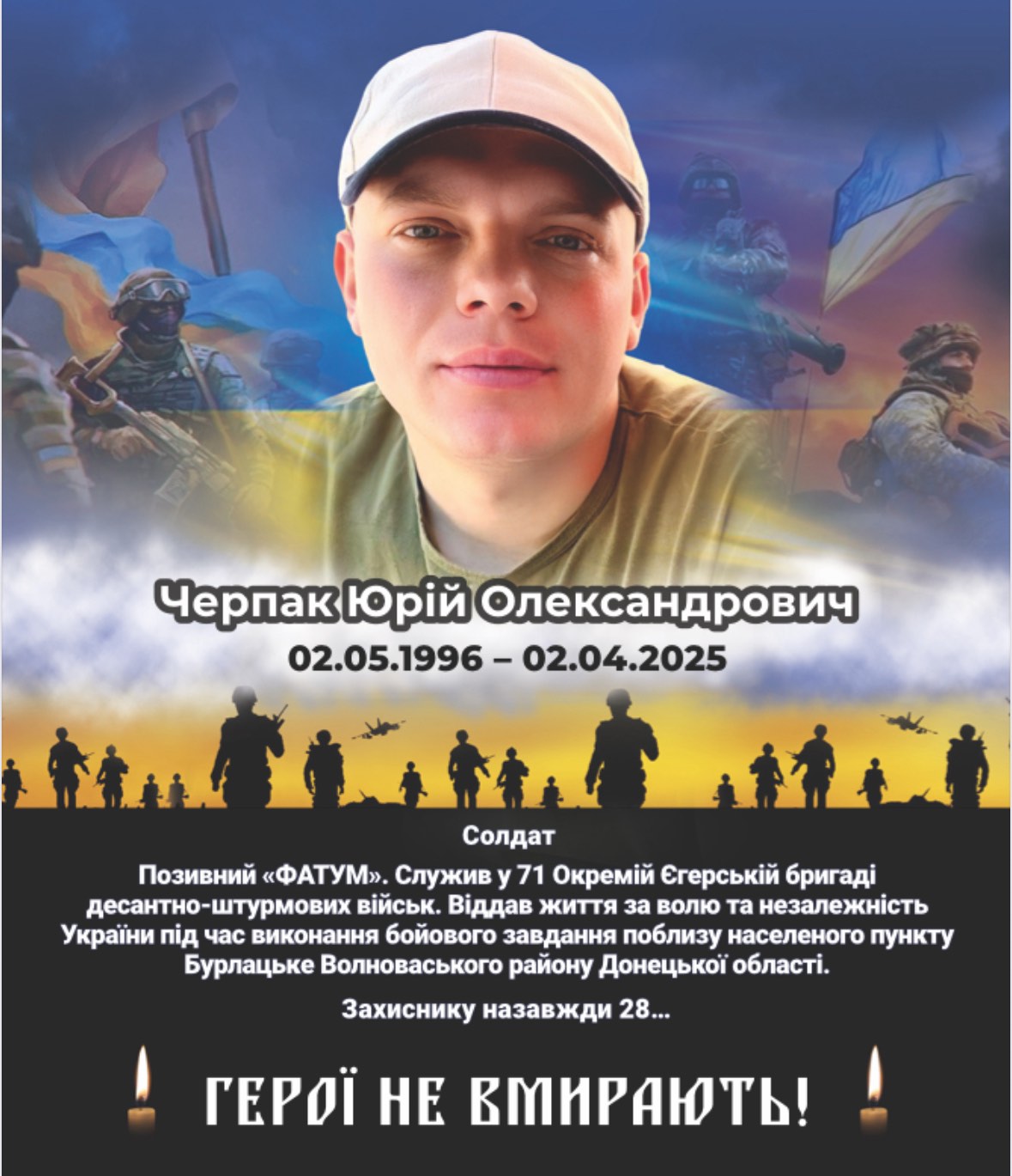 Черпак Юрій Олександрович з позивним «ФАТУМ». Народився 02 травня 1996 р. в невеличкому селі, у сімʼї простих робітників Олександра та Віри. Він був першою та бажаною дитиною у сімʼї.