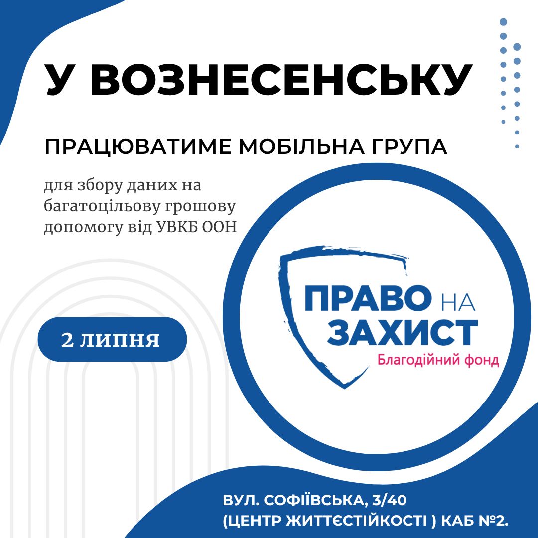 📣 02 липня 2025 року у місті Вознесенськ відбудеться важлива подія для місцевої громади та переселенців: мобільна група благодійного фонду «Право на захист» розпочне свою роботу зі збору даних та оформлення багатоцільової грошової допомоги від УВКБ ООН. Ця ініціатива спрямована на підтримку найбільш вразливих верств населення, надаючи значну фінансову допомогу у розмірі 10 800 грн на кожного члена родини. Така підтримка є критично важливою в поточних умовах, допомагаючи родинам покривати базові потреби та покращувати якість життя.