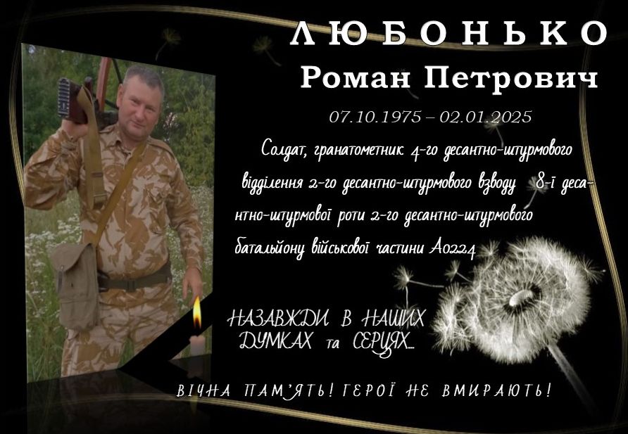 💔02 січня 2026 року минають перші скорботні роковини смерті Захисника України ЛЮБОНЬКА РОМАНА ПЕТРОВИЧА