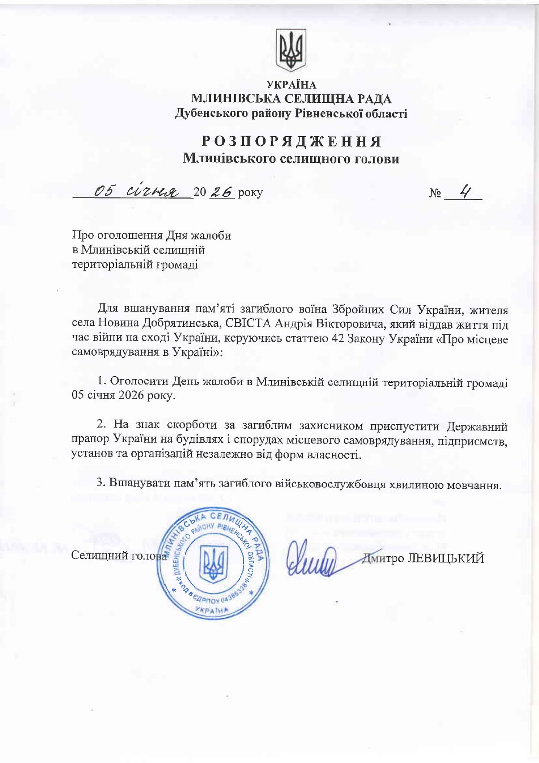 🇺🇦🕯️05 січня 2026 року – День жалоби у Млинівській селищній територіальній громаді для вшанування пам’яті загиблого Захисника України, жителя села Новина Добрятинська, СВІСТА Андрія Вікторовича.