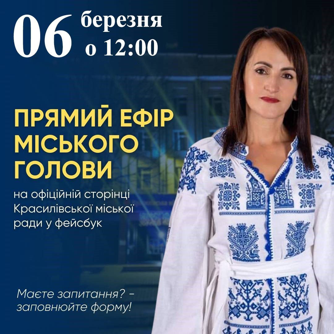 06 березня о 12:00 відбудеться важлива подія для мешканців Красилівської міської територіальної громади. Міський голова Ніла ОСТРОВСЬКА (Ніла Островська) проведе прямий ефір на сторінці Красилівської міської ради у мережі Facebook. Це унікальна можливість для кожного мешканця поставити запитання, що їх турбують, безпосередньо очільниці громади.