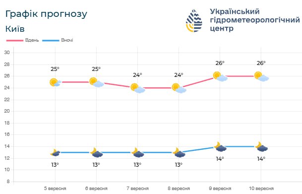 Незважаючи на незначне потепління, температура повітря не зазнає кардинальних змін. Нічна прохолода швидко поступатиметься місцем комфортному денному теплу. У Києві температурний режим буде доволі стабільним: нічні показники коливатимуться в межах 13-15°C, а денні сягатимуть 24-27°C. Для Київської області діапазон температур буде дещо ширшим, особливо вночі – від 9°C до 15°C, тоді як вдень повітря прогріватиметься до 24-27°C. Таким чином, до кінця першої декади вересня утримається справжня літня погода, що дозволить насолоджуватися останніми теплими днями.