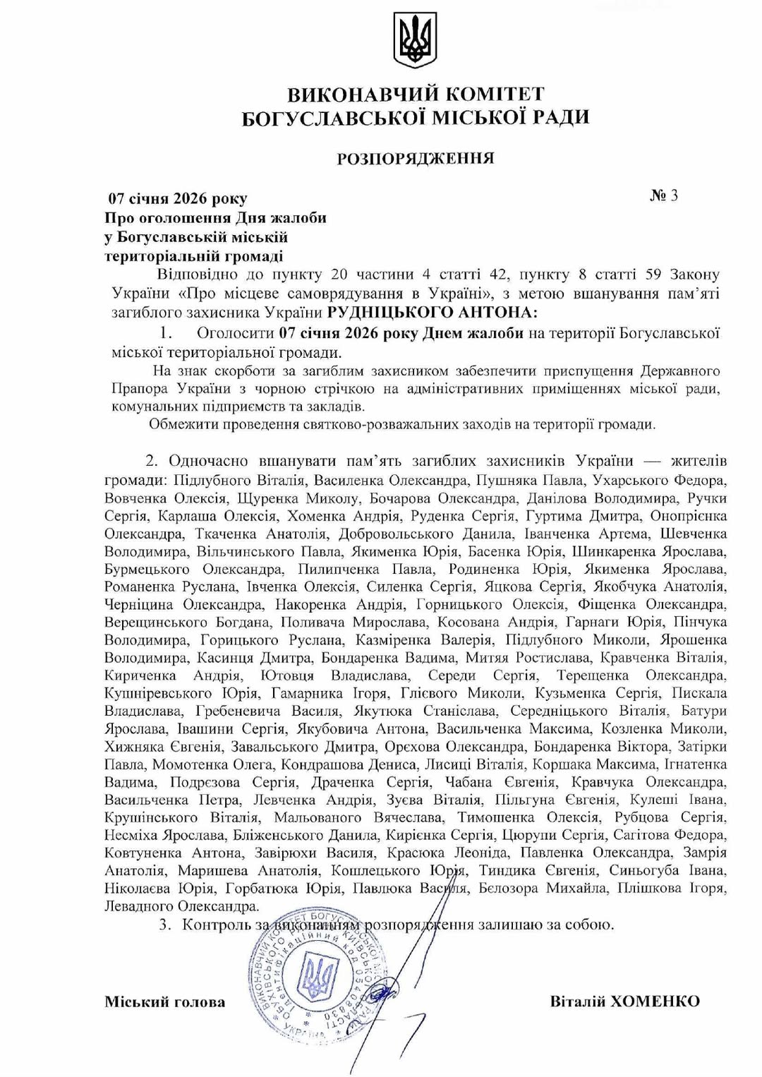 07 січня 2026 року, розпорядженням міського голови за № 3, з метою вшанування пам’яті загиблого захисника України РУДНІЦЬКОГО АНТОНА, на території Богуславської міської територіальної громади оголошено День жалоби.
