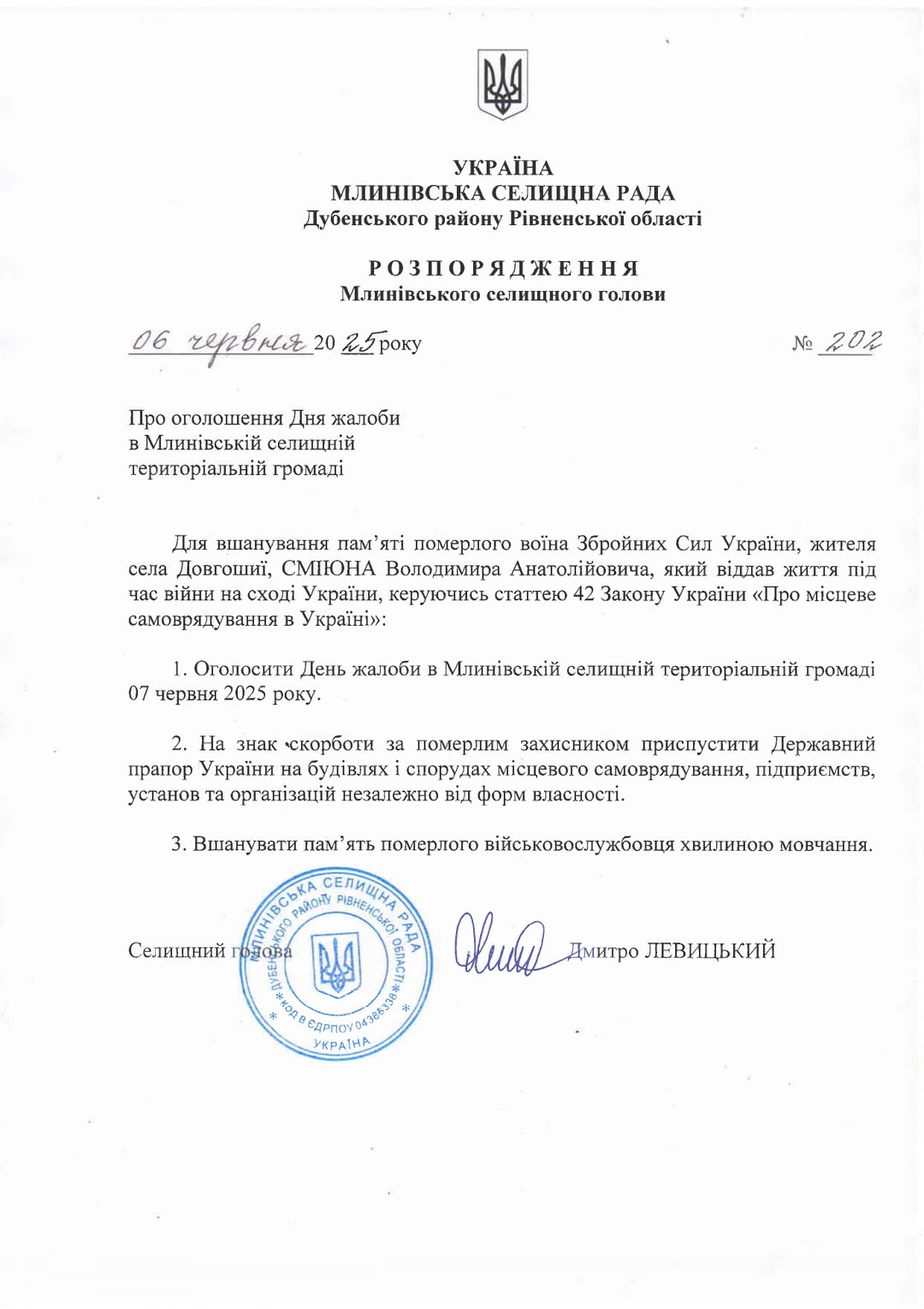 Ми закликаємо всіх жителів Млинівської громади приєднатися до молитов та заходів, присвячених вшануванню пам’яті Сміюна Володимира Анатолійовича. Нехай цей день стане символом нашої єдності та незламної віри у перемогу України. Разом ми сильніші!