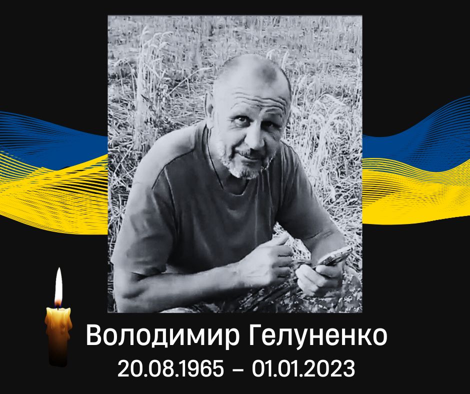 Стрілець 122-го (Ізюмського) окремого батальйону територіальної оборони 113-ї ОБТрО Володимир Миколайович Гелуненко загинув під час виконання бойового завдання на Бахмутському напрямку 1 січня 2023 року.