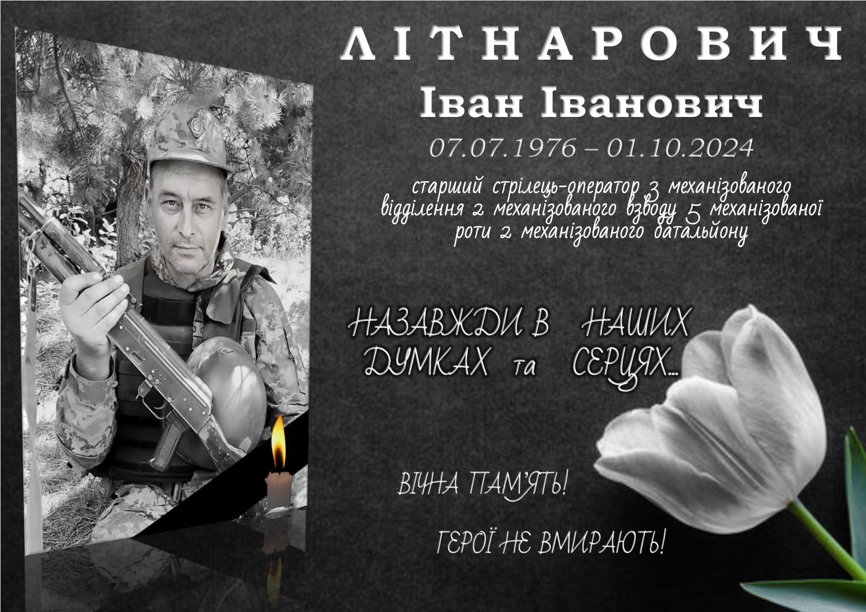 🕯 Висловлюємо найщиріші співчуття родині та близьким. Ми сумуємо разом з вами, розділяючи ваш біль втрати. Пам’ять про Івана Літнаровича житиме вічно у серцях тих, хто цінує мир та свободу. Його жертовність не буде марною.