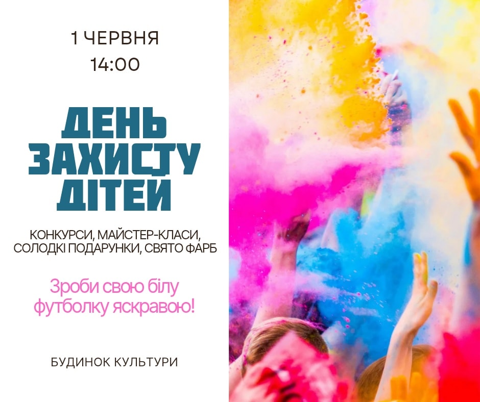 Запрошуємо всіх на святковий захід з нагоди Міжнародного дня захисту дітей, який відбудеться 1 червня о 14:00 біля будинку культури. Це чудова нагода весело та змістовно провести час разом з дітьми!