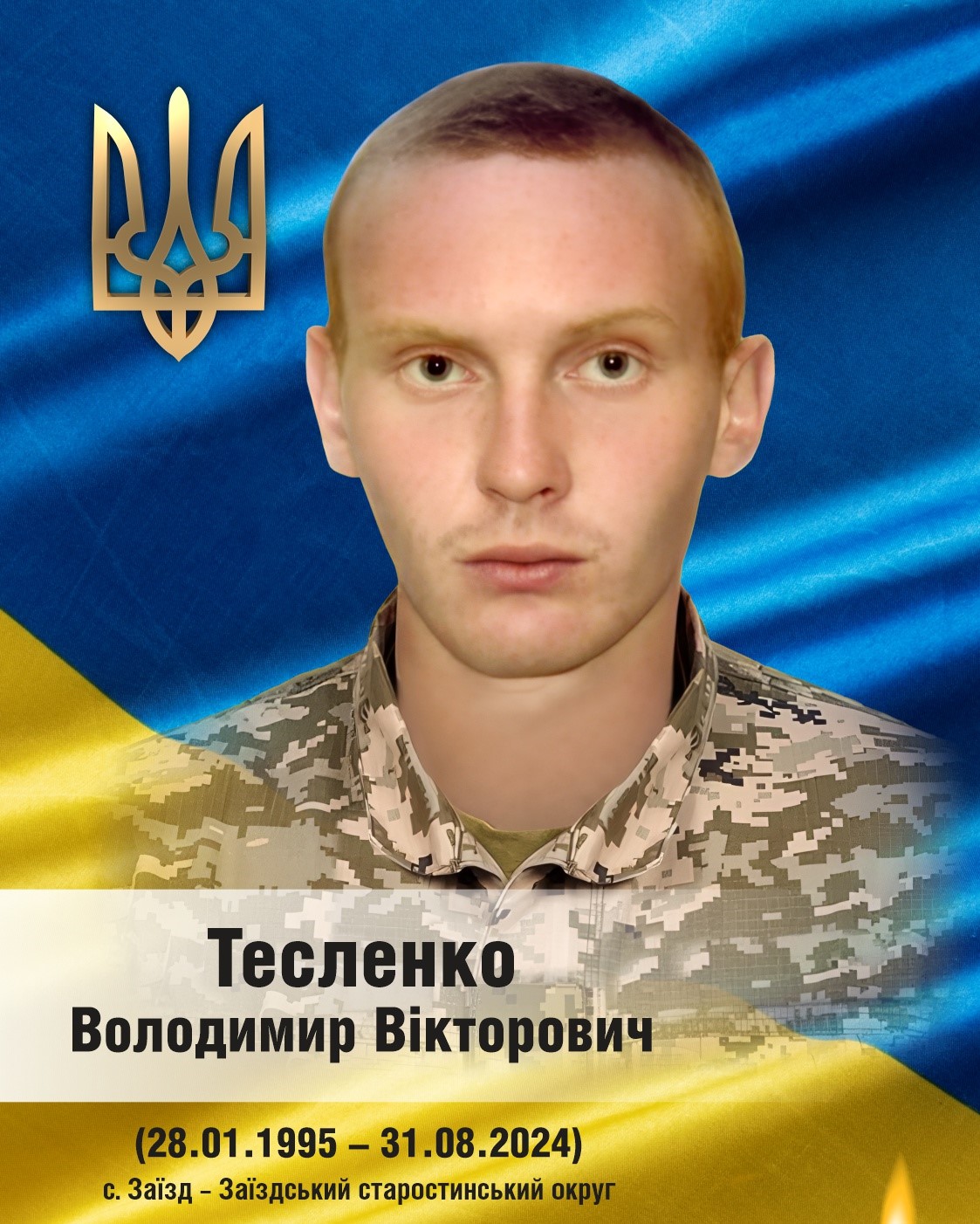 Ще один медик-військовослужбовець нашої громади з с.Заїзд (Заїздський старостат) – Тесленко Володимир Вікторович. 22 травня 2024 року був мобілізований до Збройних Сил України. 31 серпня 2024 року помер від поранення, отриманого під час виконання обов’язків військової служби із захисту Батьківщини при веденні бойових дій з підрозділами держави-агресора. Йому назавжди 29 років… Народився 28 січня 1995 року в с. Заїзд. Володимир мав активну громадську позицію, готовий прийти на допомогу, вболівав за всі питання, пов’язані з життєдіяльністю Заїздського старостату. Нагороджений Почесною відзнакою Сухополов’янської сільської ради «ЗАХИСНИК УКРАЇНИ – ГЕРОЙ СУХОПОЛОВ’ЯНСЬКОЇ ГРОМАДИ».