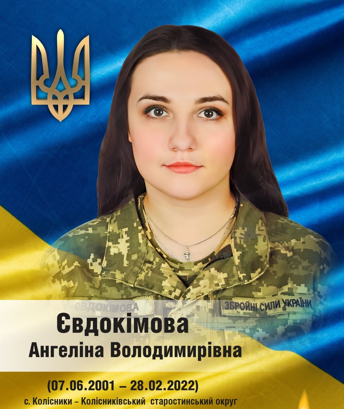 Євдокімова Ангеліна Володимирівна народилася 07 червня 2001 року у м.Прилуки. З 18 вересня 2013 року по 09 червня 2016 року навчалася в Сухополов’янській ЗОШ І-ІІІ ступенів. Після закінчення 9 класу в 2016-2020 роках продовжила навчання в Прилуцькому медичному фаховому коледжі за спеціальністю «сестринська справа». У 17 років втратила матір, відтоді для неї родиною стала сім’я сестри. Після закінчення навчання Ангеліна вступила на контракт до Збройних Сил України. 15.07.2020 року добровільно на проходження військової служби в м. Біла Церква. Пізніше переведена в зону АТО/ООС. У зоні бойових дій була дев’ять місяців. Нагороджена медаллю «Учасник АТО». З початком повномасштабного вторгнення продовжила службу як бойовий медик Відважна та світла Євдокімова Ангеліна загинула 28 лютого 2022 року у Київській області при виконанні службових обов’язків в результаті бойових дій під час повномасштабного вторгнення Російської Федерації на Україну: надавала допомогу пораненим після ворожого авіанальоту та потрапила під повторний напад ворожої авіації. Ангеліні назавжди залишиться 20 років… Непоправна втрата не лише для рідних та нашої громади, а й усієї України. Указом Президента України № 134 від 14 березня 2022 року «за особисту мужність під час виконання бойових завдань, самовіддані дії, виявлені у захисті державного суверенітету та територіальної цілісності України, вірність військовій присязі» молодший сержант Євдокімова Ангеліна Володимирівна нагороджена орденом «За мужність» ІІІ ступеня (посмертно). Нагороджена Почесною відзнакою Сухополов’янської сільської ради «ЗАХИСНИК УКРАЇНИ – ГЕРОЙ СУХОПОЛОВ’ЯНСЬКОЇ ГРОМАДИ». У День народження нашої Захисниці, 07 червня 2023 року, на фасаді Сухополов’янського ліцею в адміністративному центрі громади – с. Сухополова встановлена меморіальна дошка на честь військовослужбовиці Ангеліни Євдокімової. Вічна пам’ять світлій та відважній захисниці України!