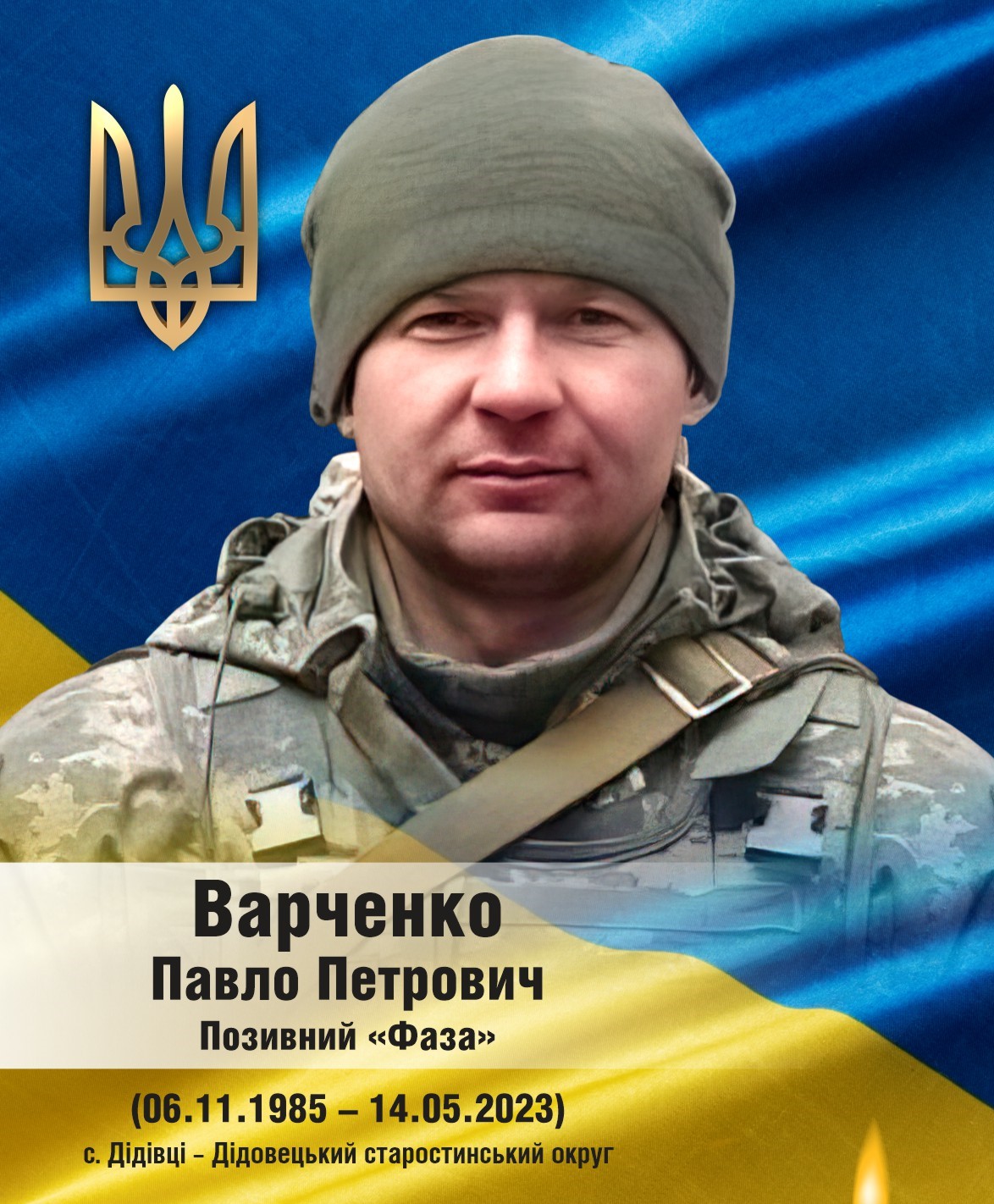 Також згадаймо цього дня захисника із Сухополов’янської громади Варченка Павла Петровича (позивний «Фаза») з с.Дідівці (Дідовецький старостат), який у січні 2023 року долучився до оборонців України. Служив у складі одного з підрозділів військової частини на посаді бойового медика. Позивний «Фаза». Народився Варченко Павло Петрович 06 листопада 1985 року в с. Дідівці Прилуцького району Чернігівської області. Проживав з мамою Вікторією Антонівною. 08 січня 2023 року був призваний Прилуцьким РТЦК та СП на військову службу бойовим медиком Збройних сил України. Загинув Павло Варченко 14 травня 2023 року від кульового поранення, отриманого в ході стрілецького бою, під час виконання бойового завдання на Донецькому напрямку. Нагороджений Почесною відзнакою Сухополов’янської сільської ради «ЗАХИСНИК УКРАЇНИ – ГЕРОЙ СУХОПОЛОВ’ЯНСЬКОЇ ГРОМАДИ». 28 червня 2025 року, у День Конституції України, на фасаді Дідівського ліцею встановлена меморіальна дошка на честь військовослужбовця Павла Варченка.