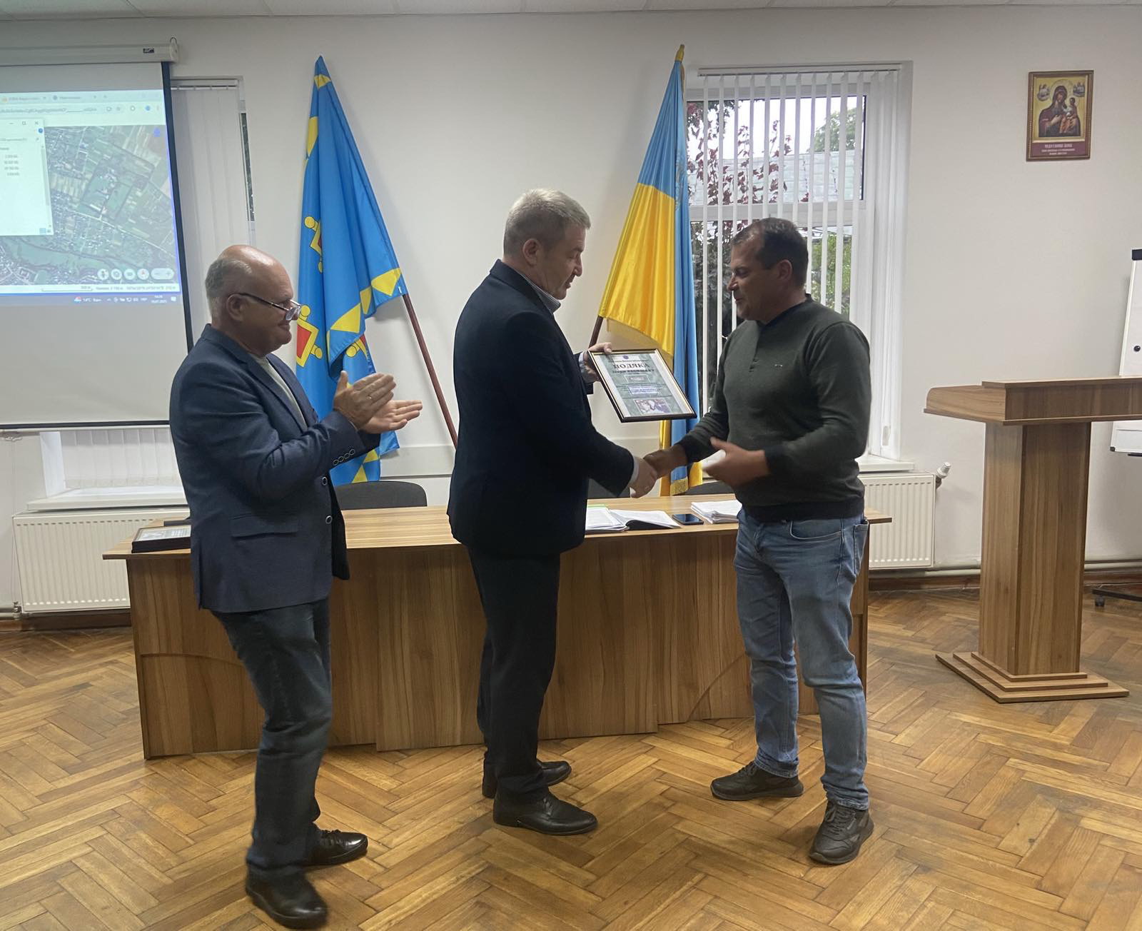 Перед початком засідання міський голова Олег Омелян із секретарем ради Володимиром Буселем відзначили подяками: