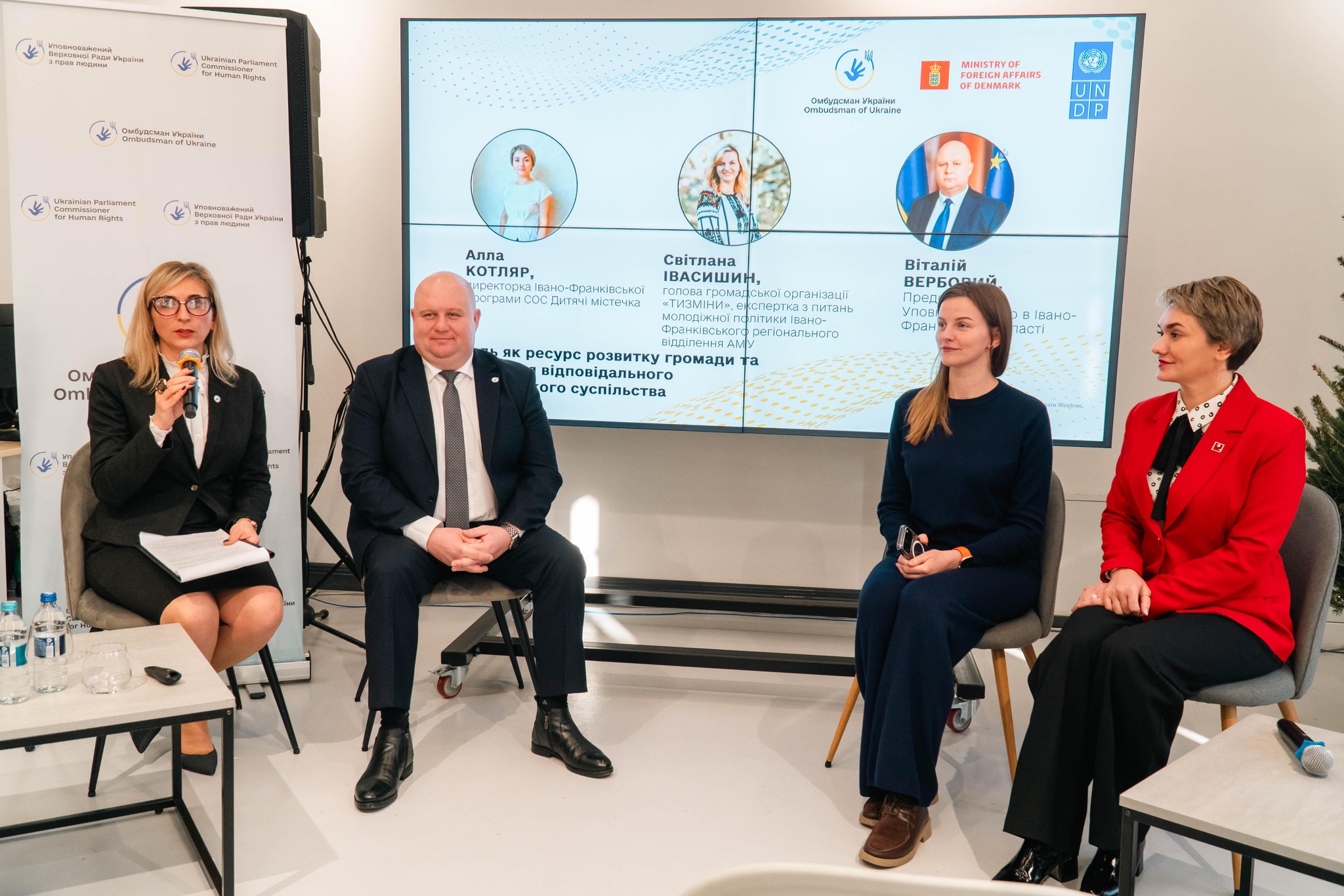 10.12.2025 р. у м. Івано-Франківськ в Палаці Потоцьких « Простір Інноваційних Креацій « Палац» відбулася Регіональна правозахисна конференція « Громада , як відправна точка прав людини в Україні : Івано-Франківщина – захід, який був організований регіональним представництвом Уповноваженого ВРУ з прав людини в Івано-Франківській області в межах проєкту «Права людини для України, фаза ІІ», який впроваджується ПРООН в Україні та фінансується Посольством Королівства Данія.