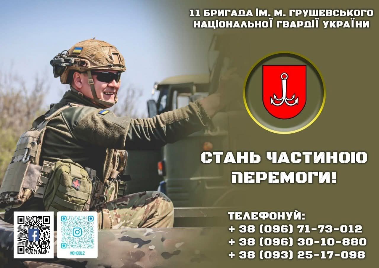 11 бригада ім. Михайла Грушевського Національної гвардії України оголошує про набір вмотивованих громадян до своїх лав. Якщо ви шукаєте можливість служити Україні та приєднатися до професійної команди, ця пропозиція для вас. Бригада запрошує на службу стрільців, операторів БПЛА, водіїв, медиків, інженерів, військових психологів, саперів та представників інших важливих спеціальностей. Особлива увага приділяється залученню військовослужбовців, які з певних причин самовільно залишили місце служби, адже вони мають можливість поновитися саме в цій бригаді.