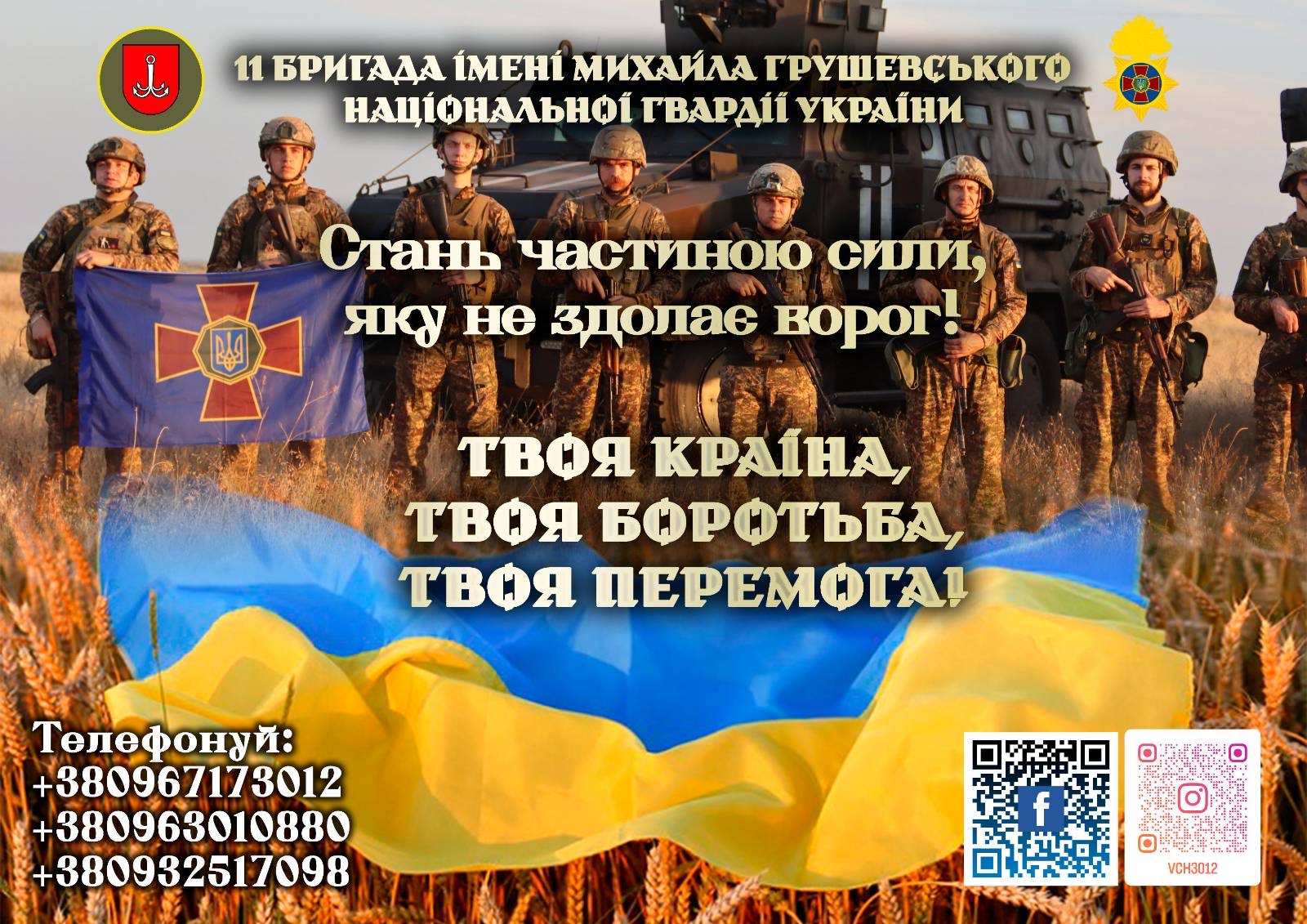 11 бригада імені Михайла Грушевського Національної гвардії України запрошує мотивованих та відповідальних громадян приєднатися до своїх лав. Якщо ви прагнете захищати Україну та маєте бажання служити, ця пропозиція саме для вас. Ми формуємо потужний бойовий кулак і потребуємо саме ТЕБЕ!